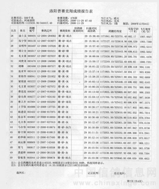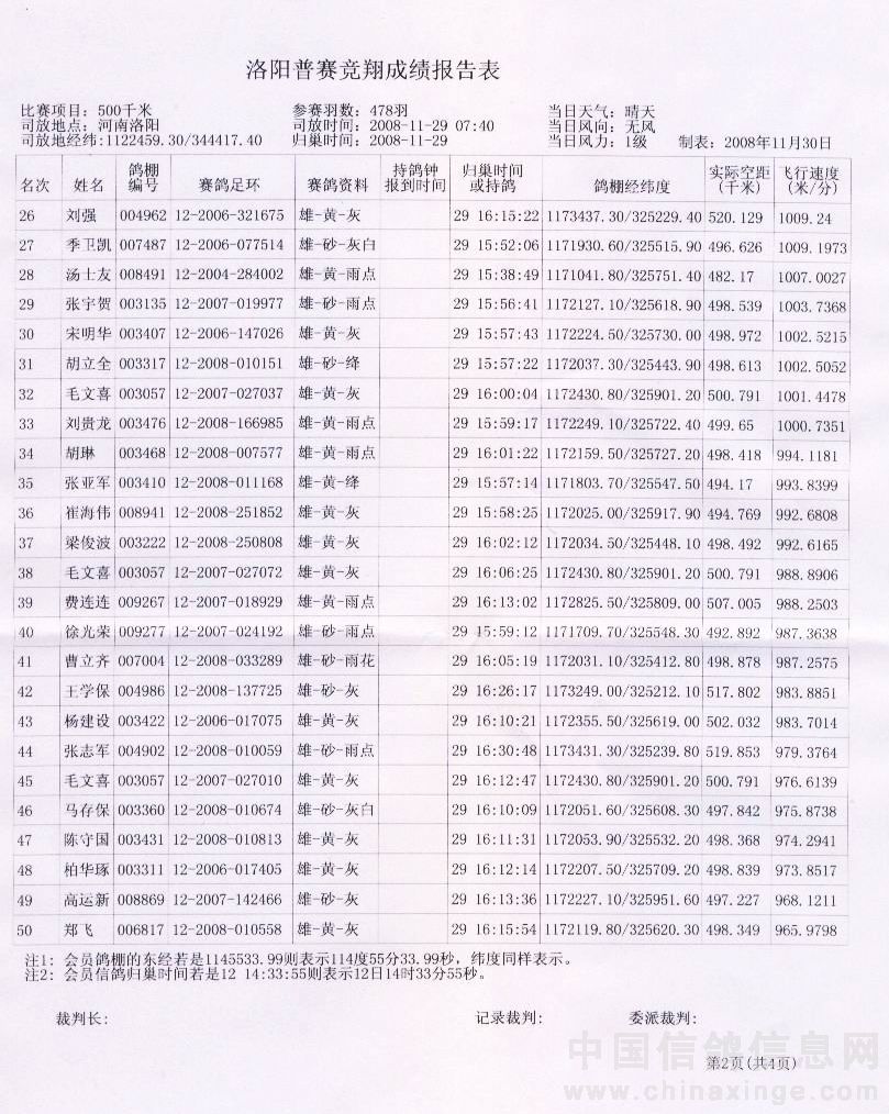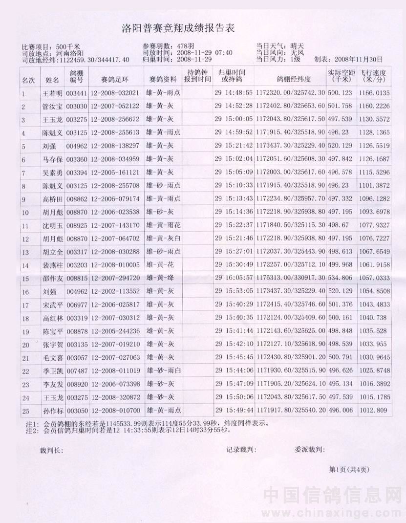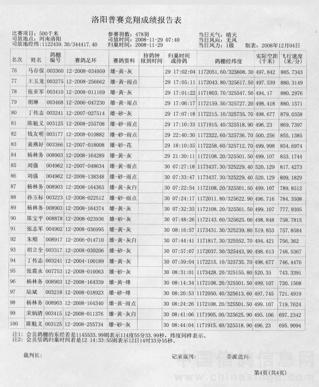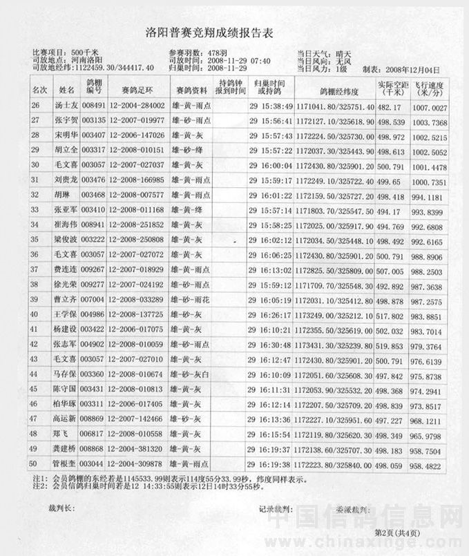 蚌埠信鸽协会08年秋洛阳站竞赛成绩