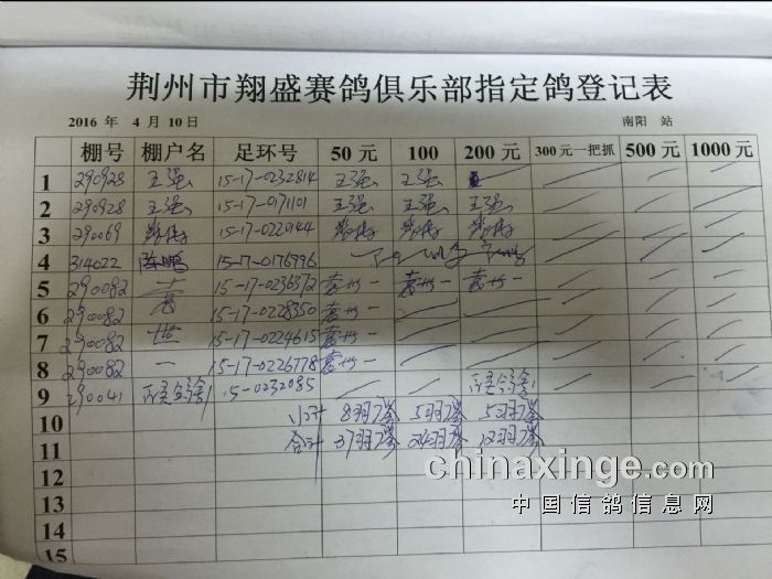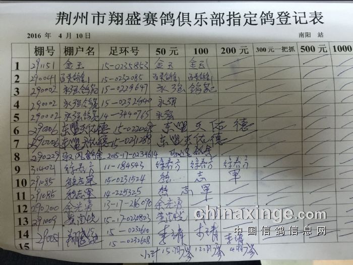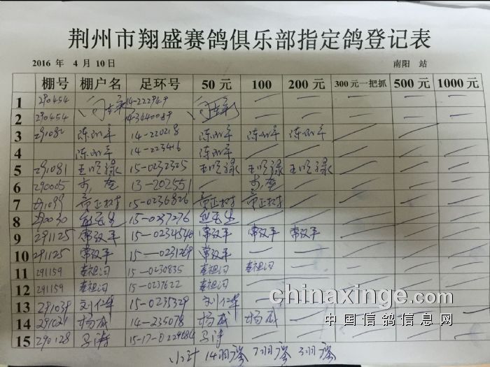 2016年春4月10日南阳300公里比赛指定鸽明细
