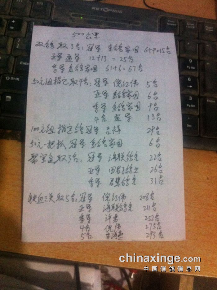 铁血鸽王三关赛冠军:倪红伟 14-15-128245 分速 1237.2957米 208名