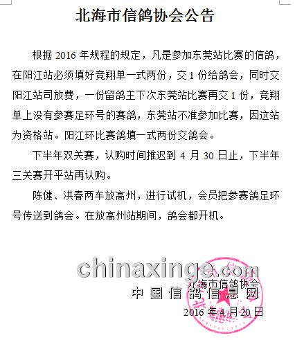 北海市信鸽协会公告