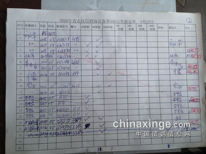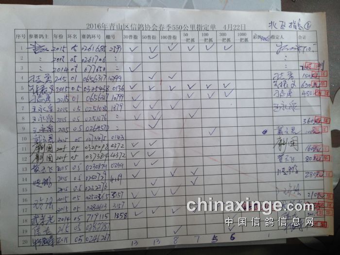2016青山鸽会春季550公里青山区北区指定奖金分配