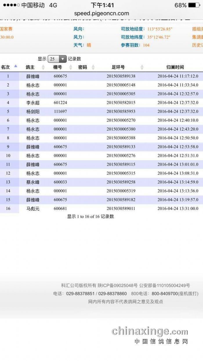 廊坊市2016年春国家赛大城县冠军验鸽