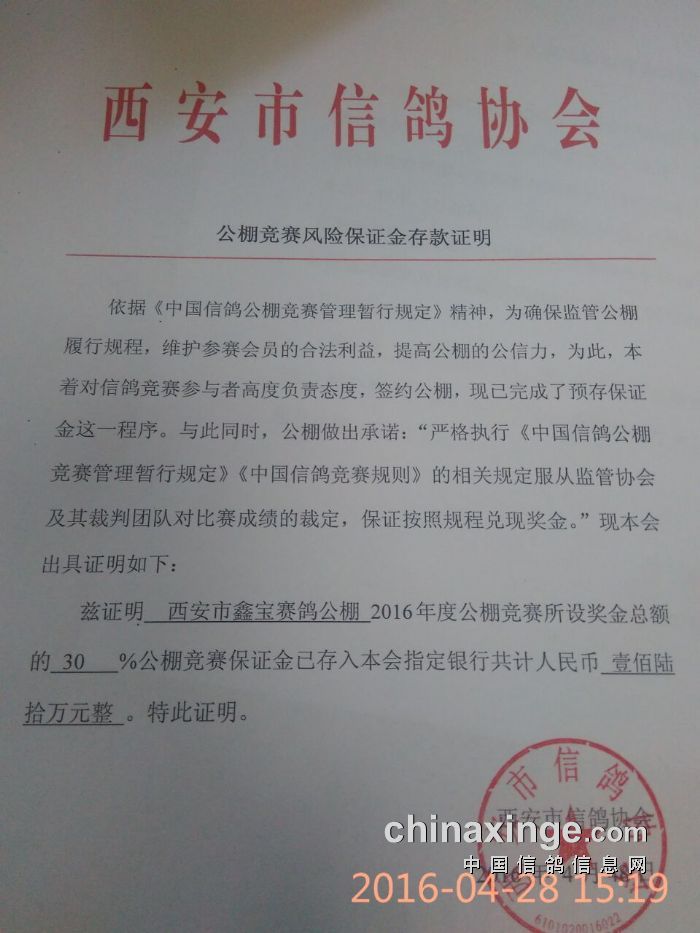 西安市鑫宝赛鸽公棚竞赛风险保证金存款证明