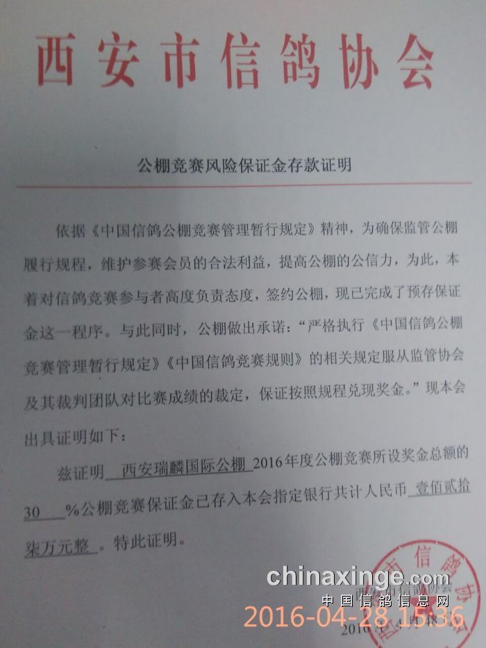 西安瑞麟国际公棚竞赛风险保证金存款证明