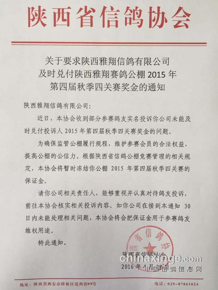 关于要求陕西雅翔信鸽有限公司及时兑付陕西雅翔公棚2015年第四届秋季四关赛奖金的通知