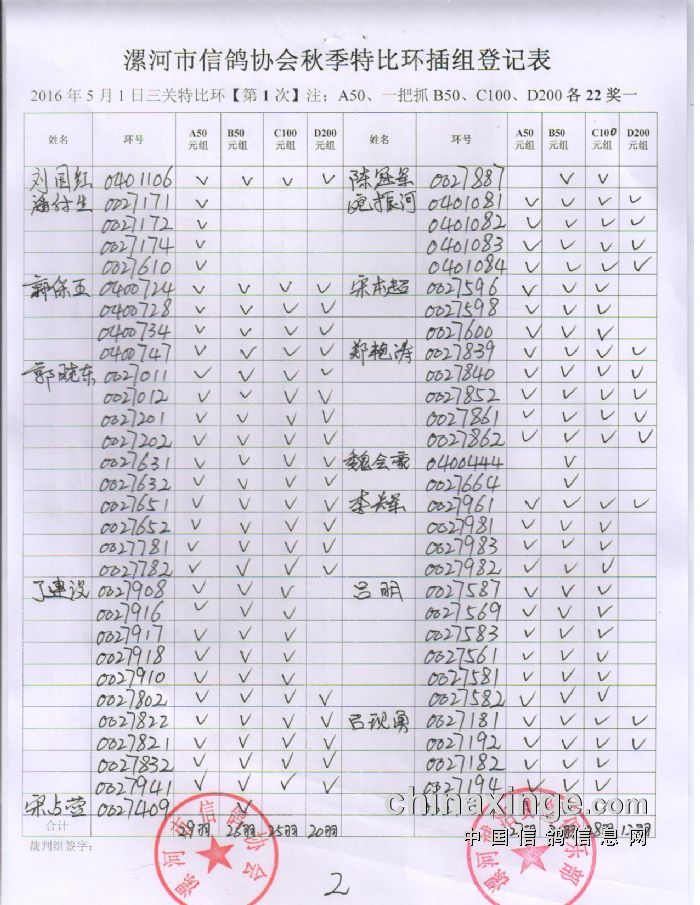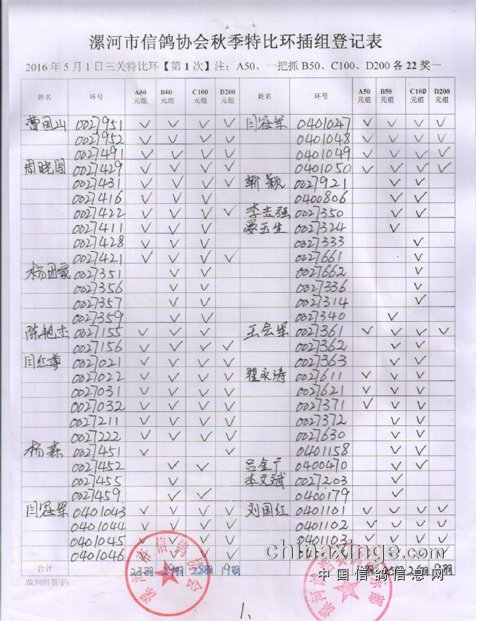 漯河市信鸽协会2019年秋季200公里新乡资格赛上笼清单