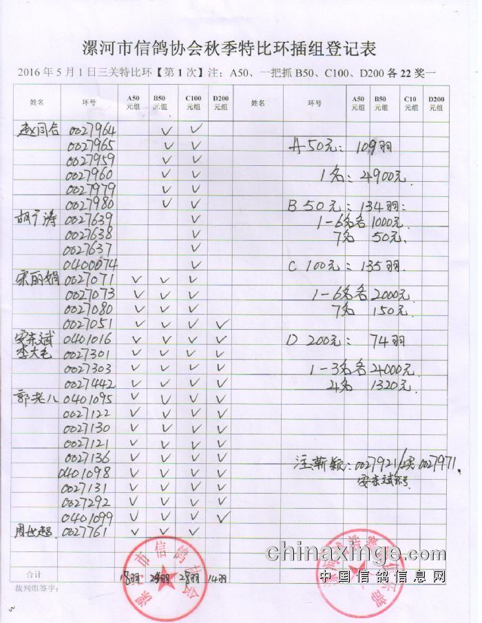 漯河市信鸽协会2019年秋季420公里内丘上笼清单