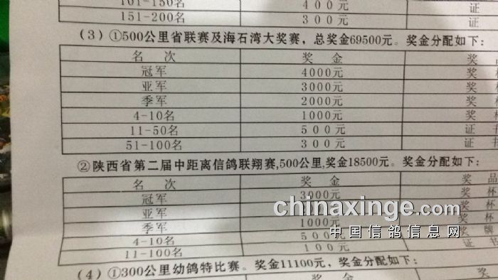 4一10名:1500元。 协会奖杯鸽省协会奖牌