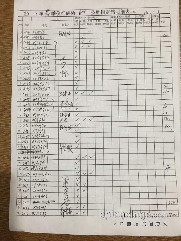 录取1名, 1名奖750.00; 注:指定鸽内容以原始清单为准,填错误填一律无效,指定费并入总奖金分配(附件2张)