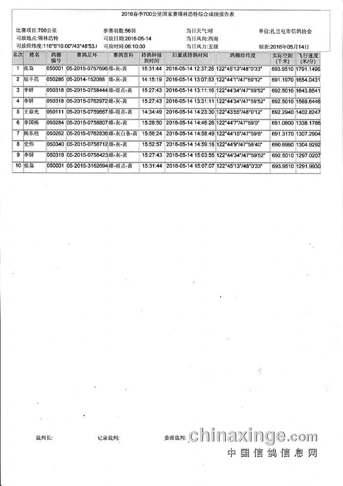 扎兰屯市700公里国家赛锡林浩特成绩单