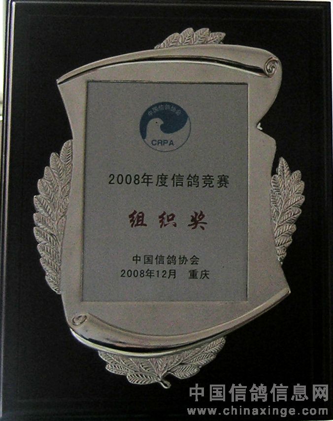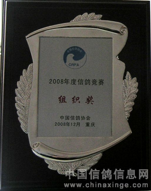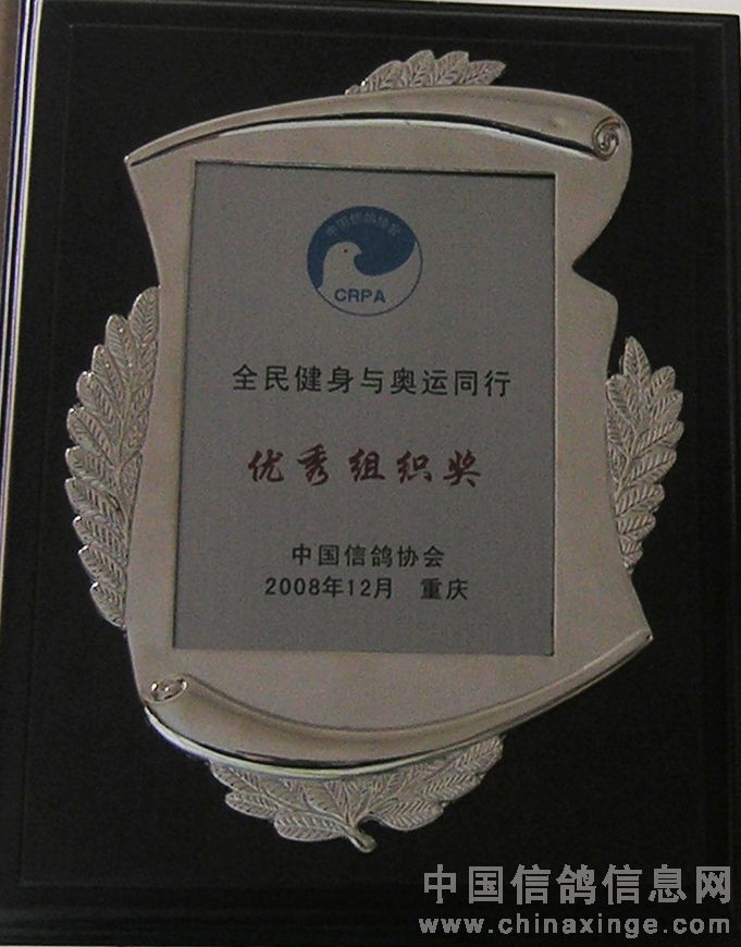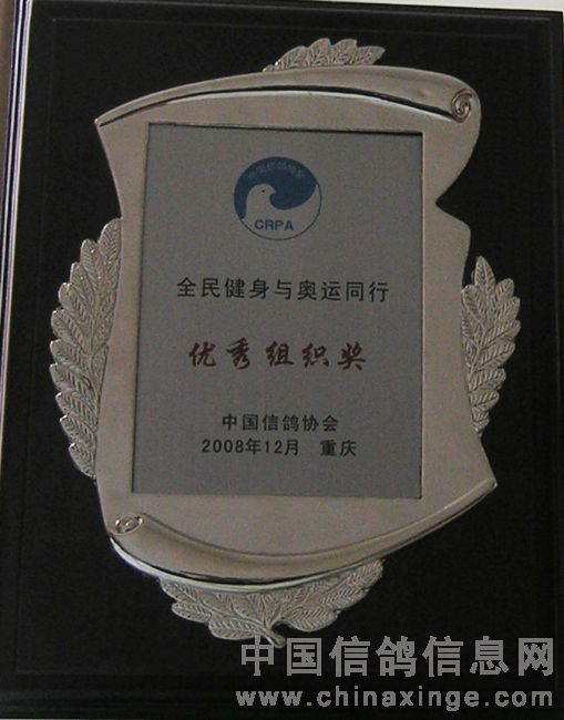 在这次颁奖大会上,中国信鸽协会还向10个省级信鸽协会分别授予“2008年信鸽竞赛组织奖”和“全民健身与奥运同行活动优秀组织奖”,江苏省和上海、新疆都荣获双奖。这两项组织奖来之不易,是对江苏各级信鸽协会和广大鸽友的褒奖。