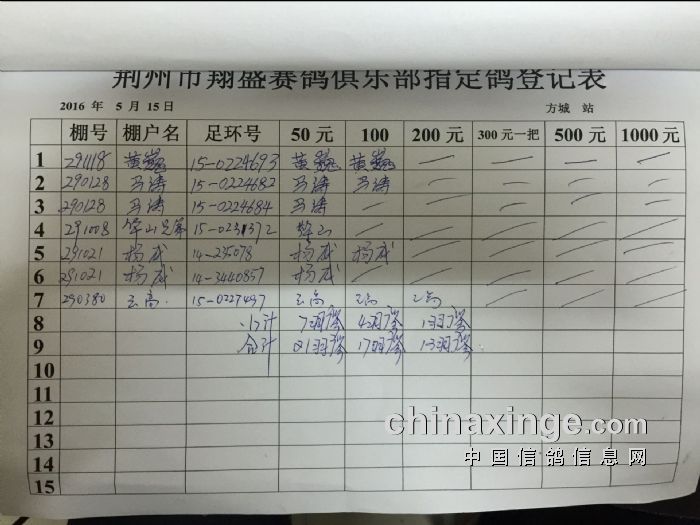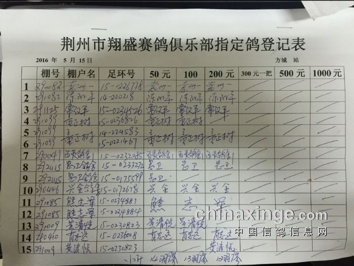 2016年5月15日方城330公里比赛指定鸽明细