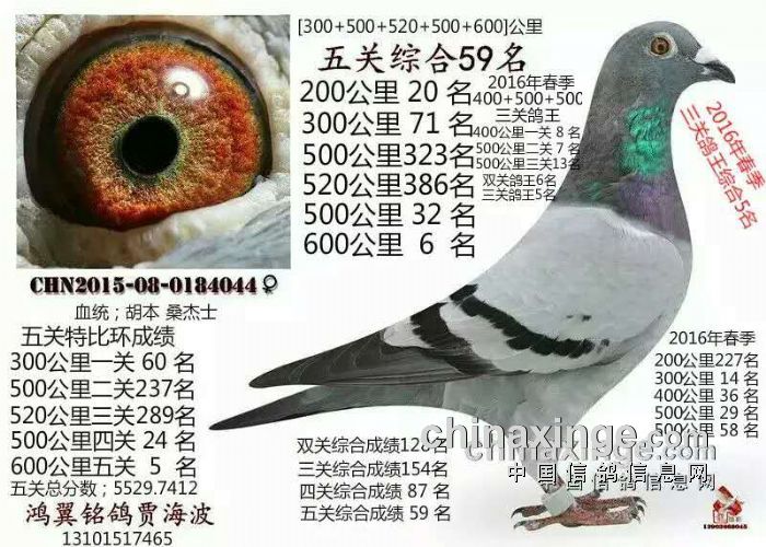 三关鸽王第五名; 贾海波 2015-08-0184044 雌 13101517465