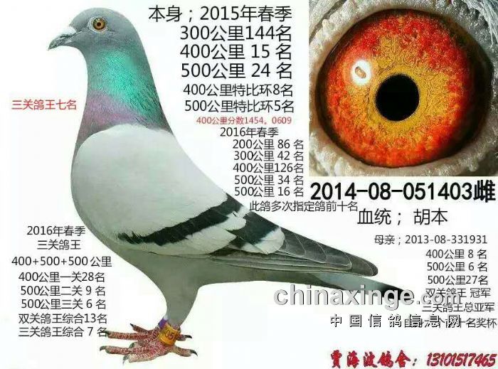 三关鸽王第七名; 贾海波 2014-08-051403 雌 13101517465