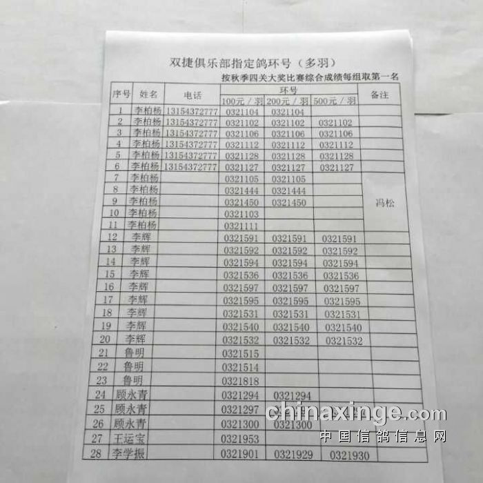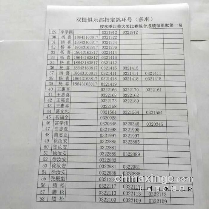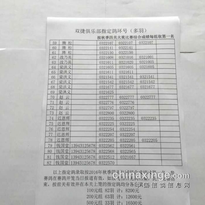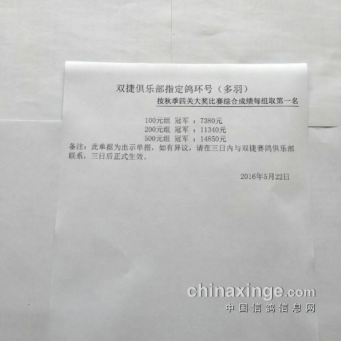 德惠市信鸽协会2022年春季大奖赛指定鸽奖金分配表