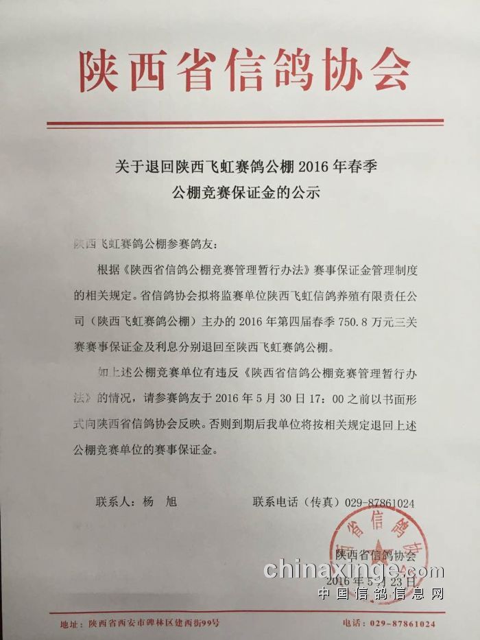 关于退回陕西飞虹赛鸽公棚2016年春季公棚竞赛保证金的公示