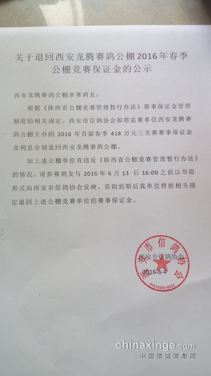 关于退回西安龙腾赛鸽公棚2016年春季公棚竞赛保证金的告示