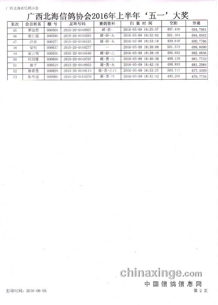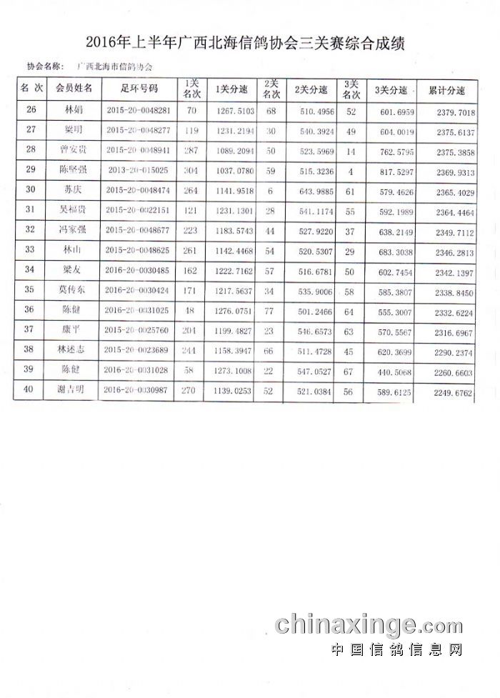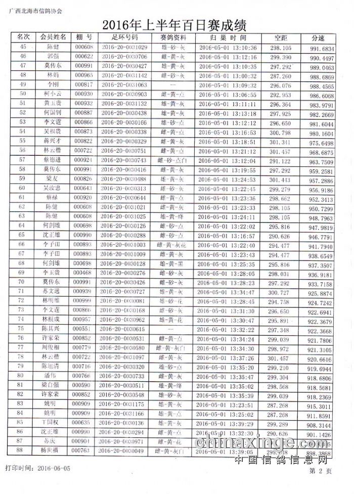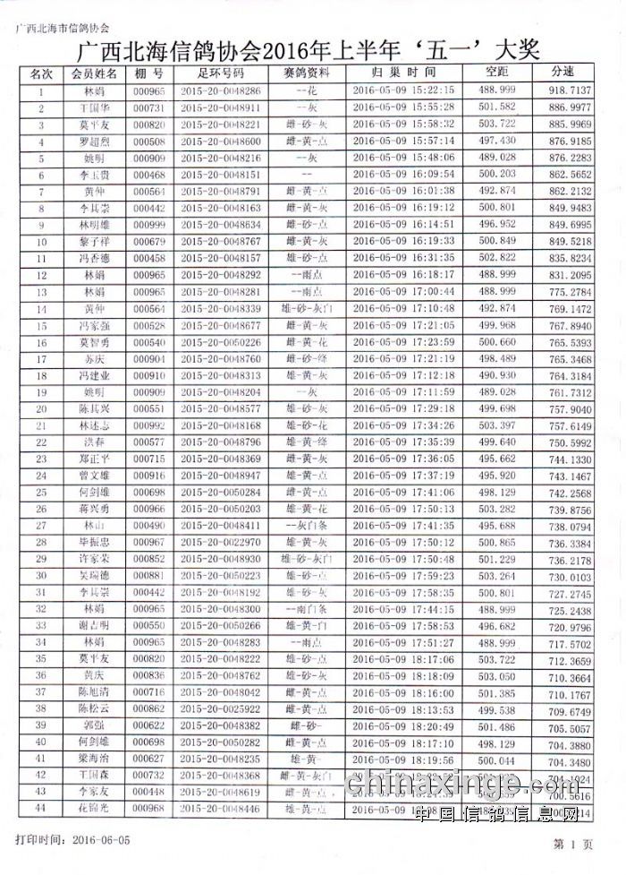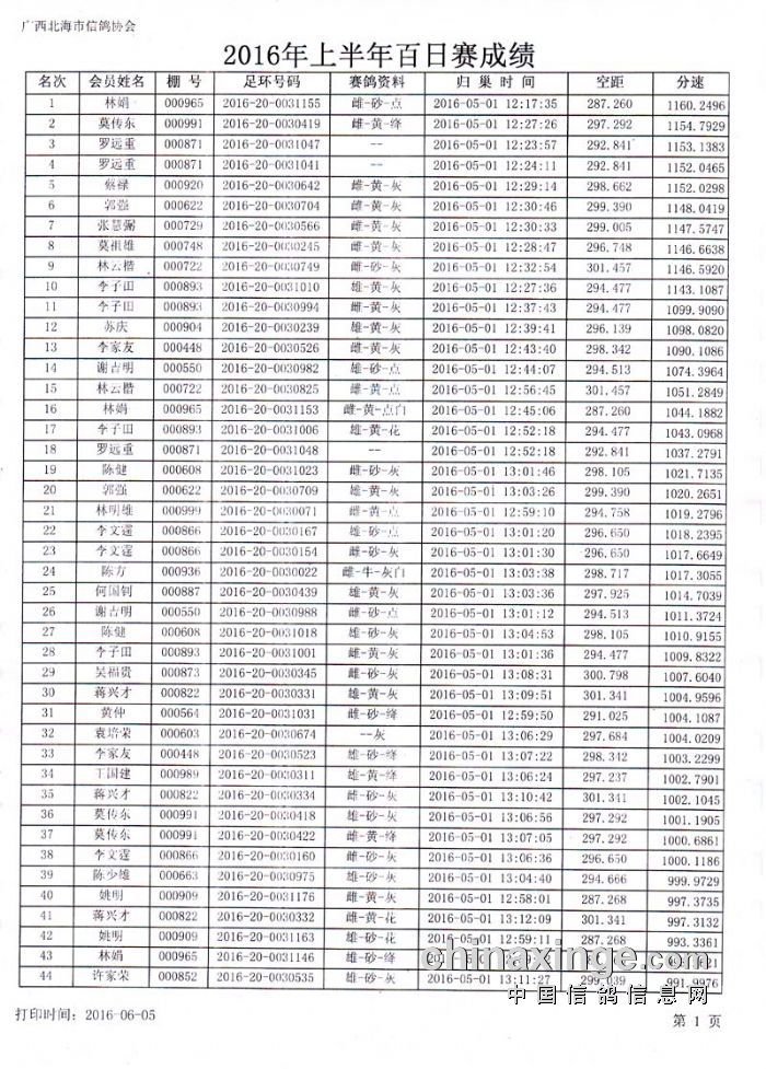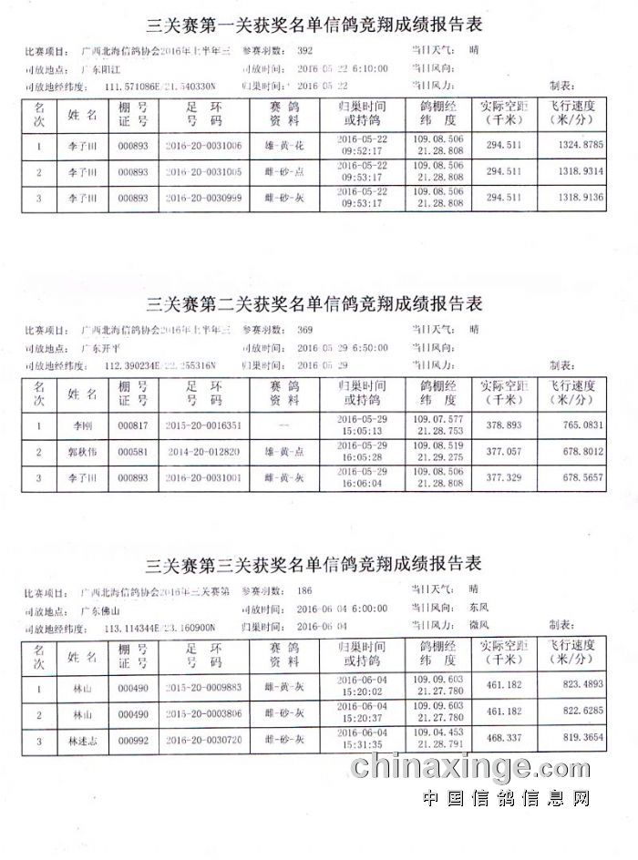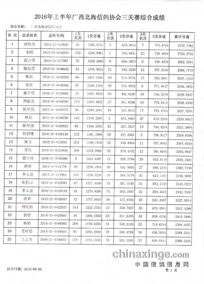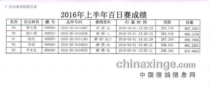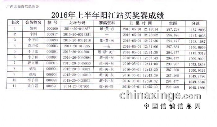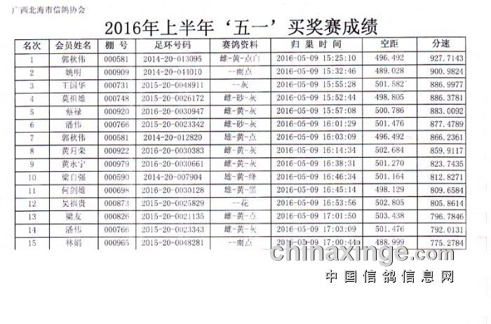 广西北海信鸽协会2016年上半年比赛的成绩单