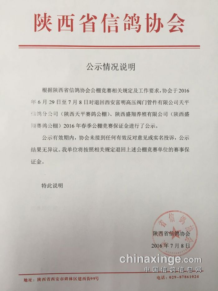 退回陕西天平赛鸽公棚、陕西盛翔赛鸽公棚2016年春季竞赛保证金公示情况说明