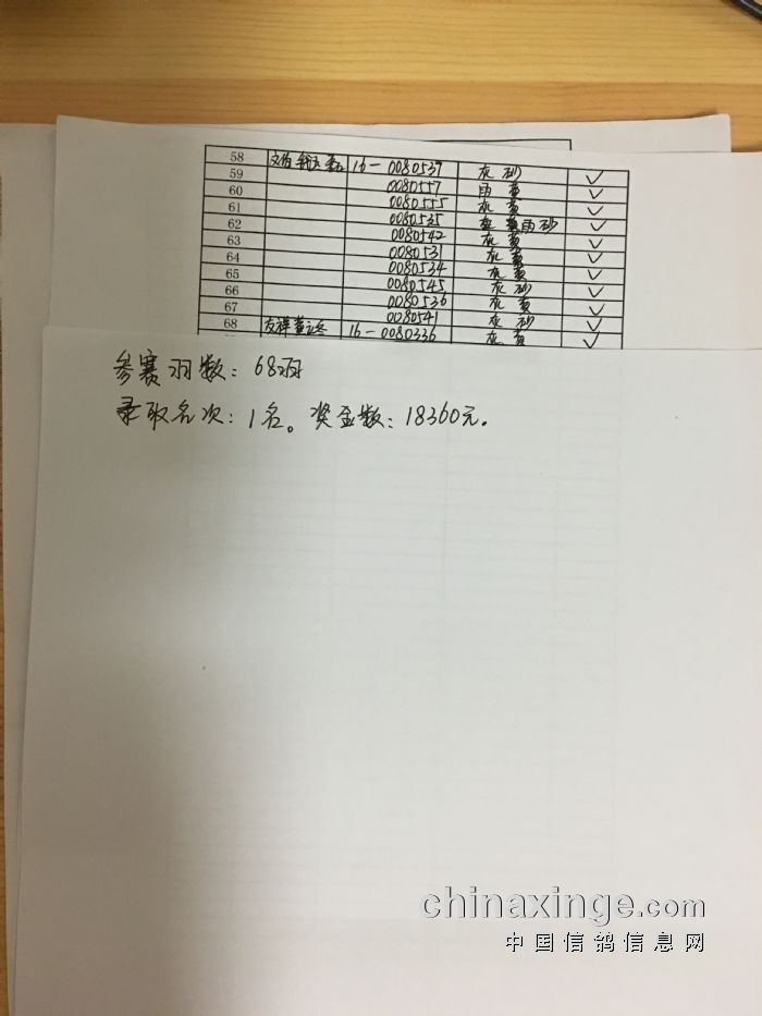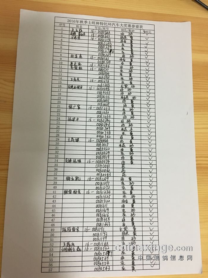 2016年秋季士旺杯特比环指定鸽暗插参赛表--汽车大奖赛