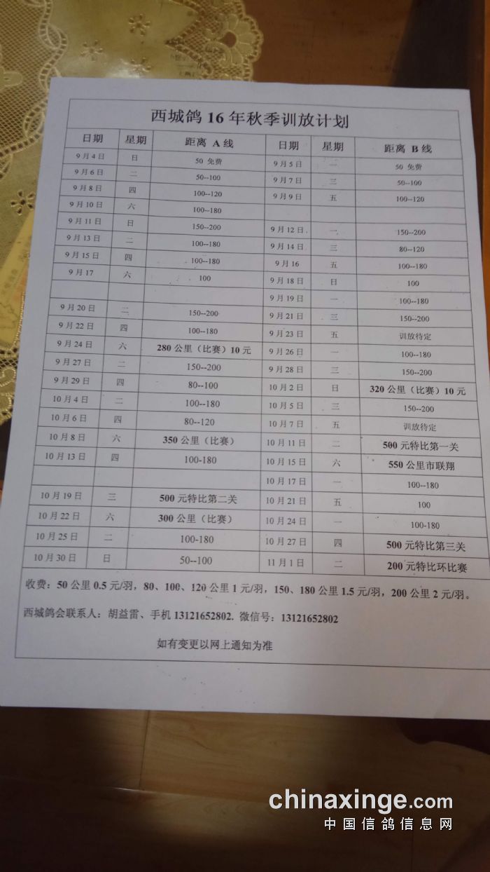胡益雷(西城)今晚26日,明早27日训放100--180公里,B线。请鸽友互相转告。谢谢!