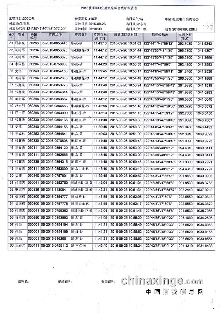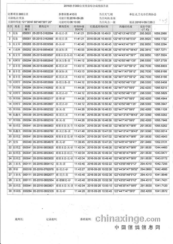 扎兰屯市信鸽协会300公里突泉比赛成绩单