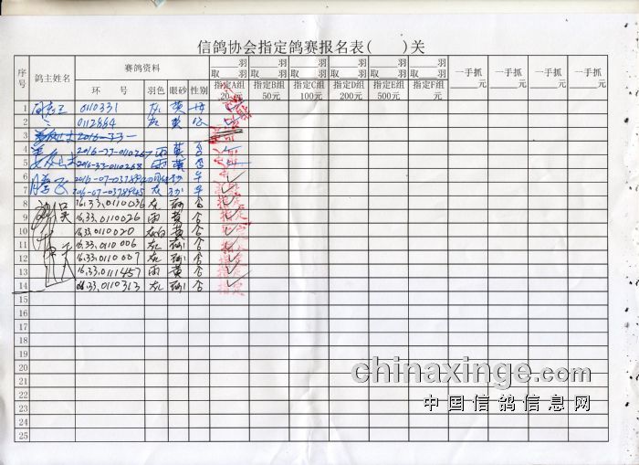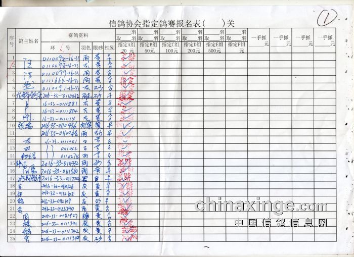 2016年秋季600公里赤峰站指定鸽原始单据