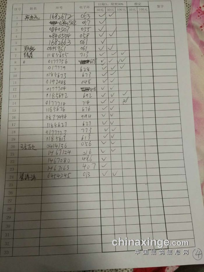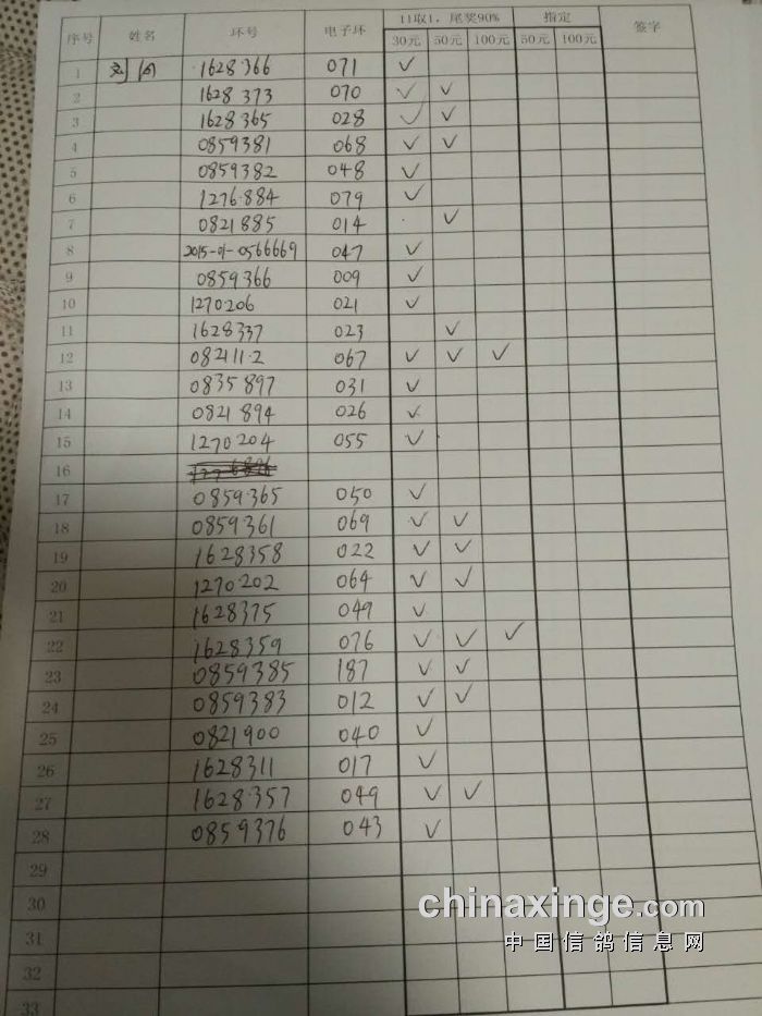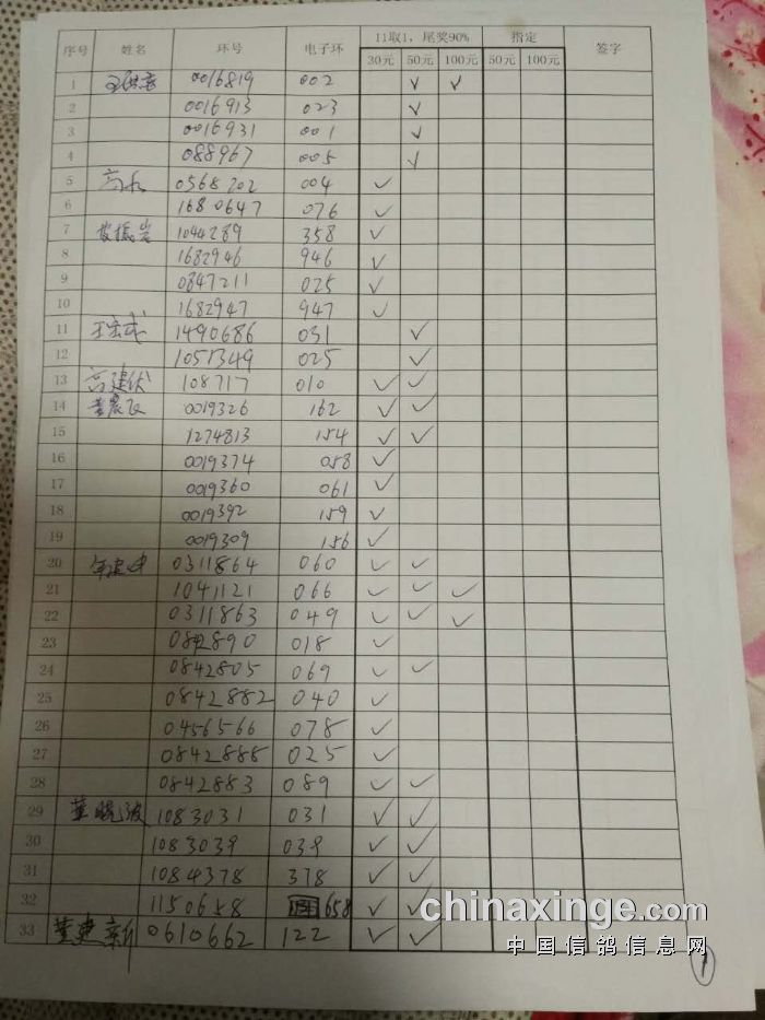 25年大兴“金洲杯”千元环一关有效归巢(按棚号)