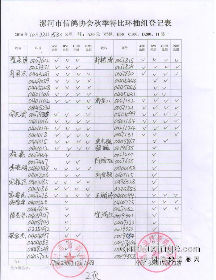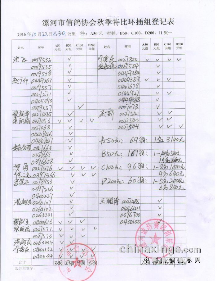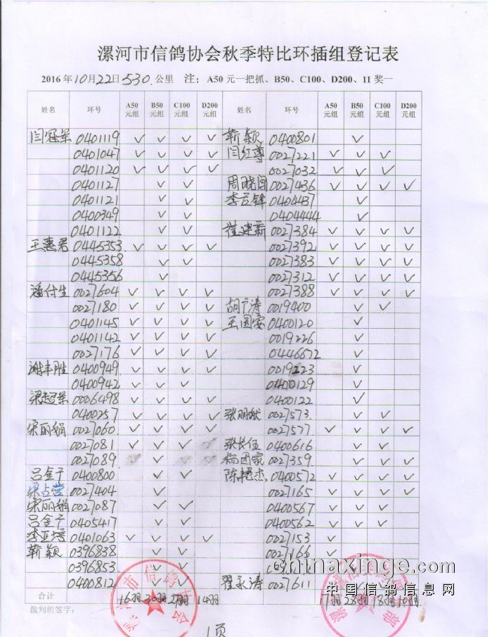 漯河市信鸽协会2019年秋季420公里内丘上笼清单