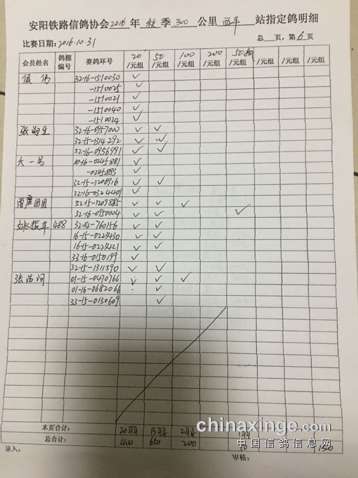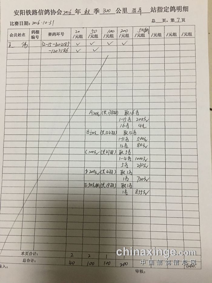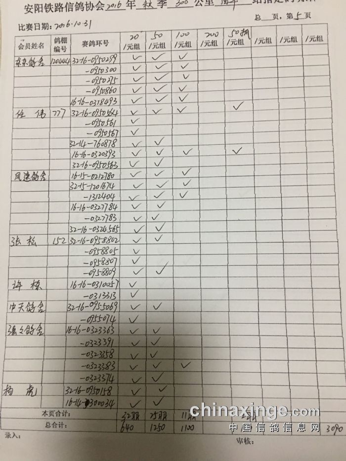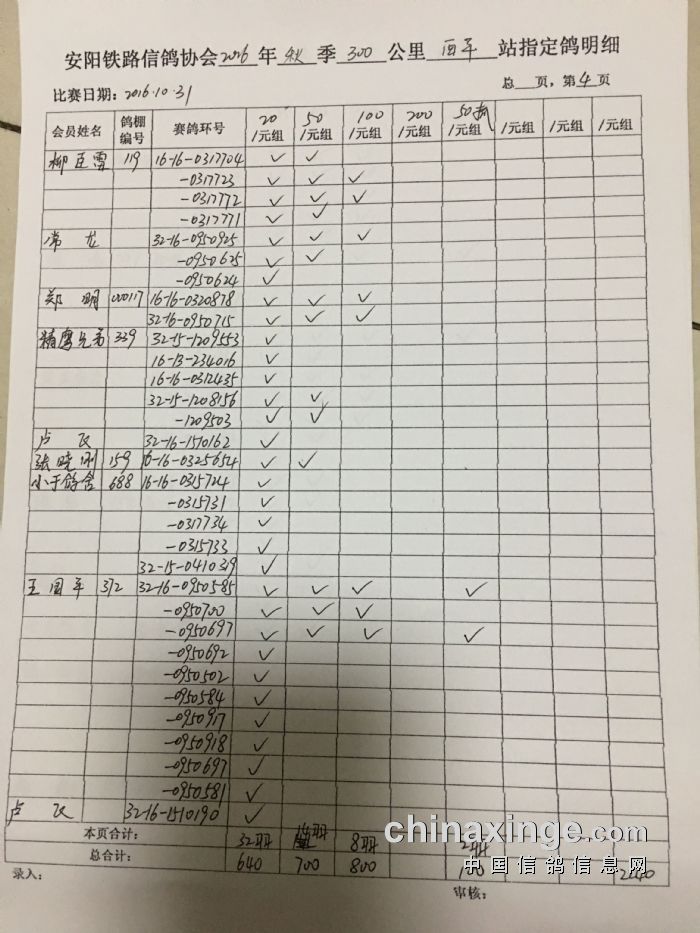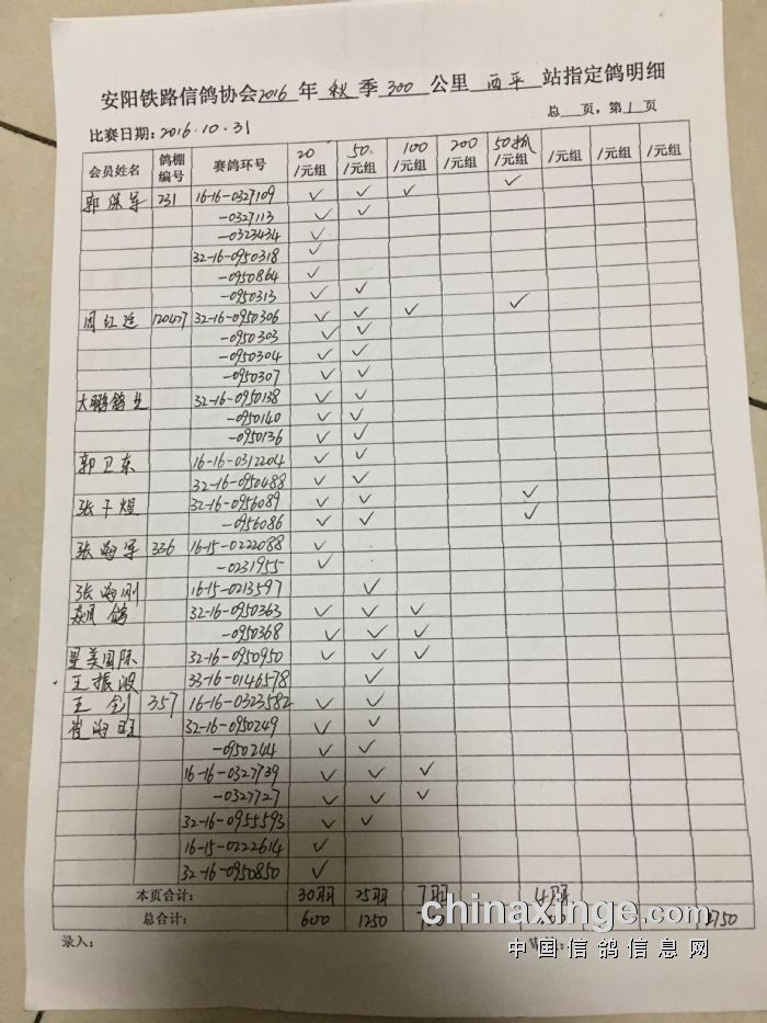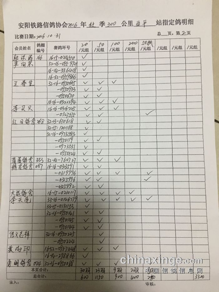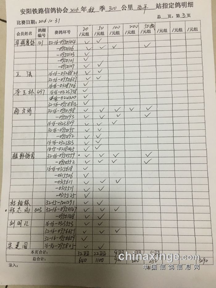 2016年秋300公里西平站指定鸽明细