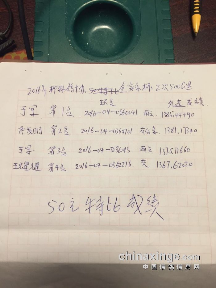2016年柳林鸽协全家乐杯2次500公里,50元特比环成绩单