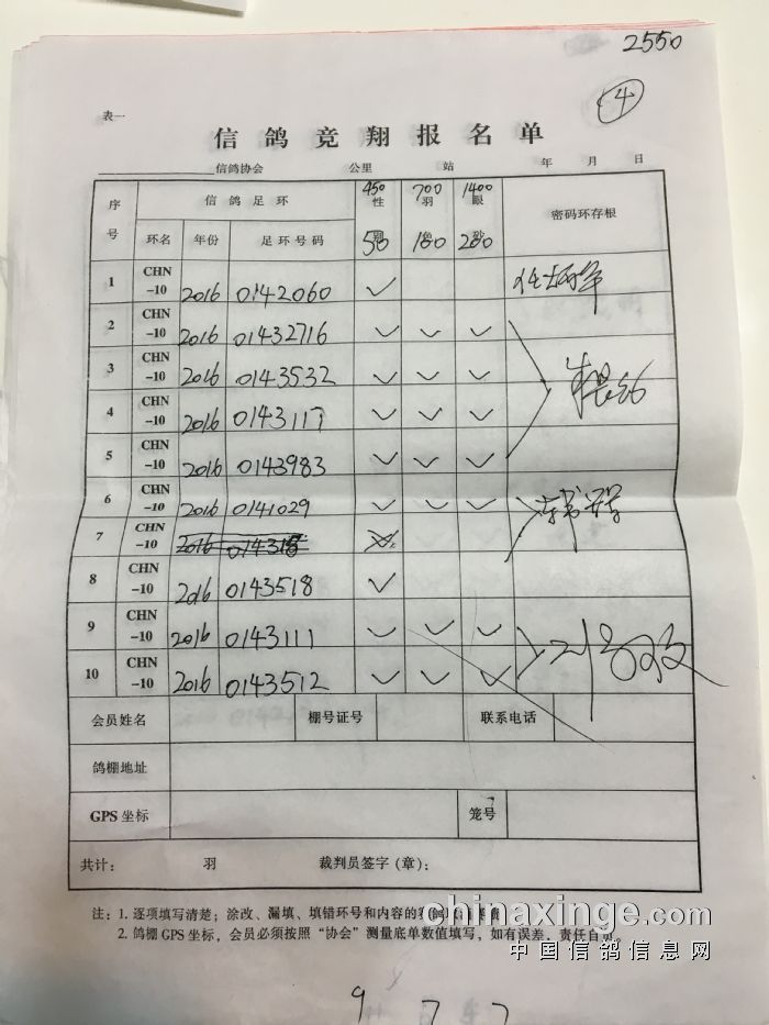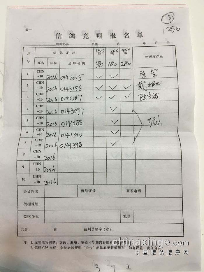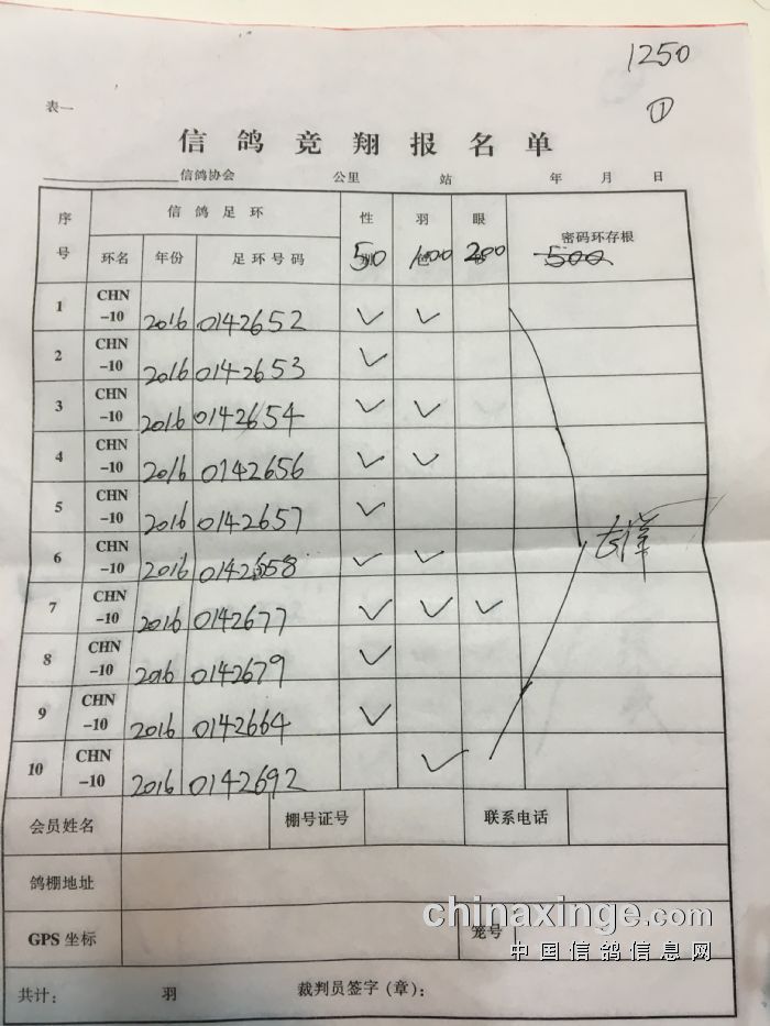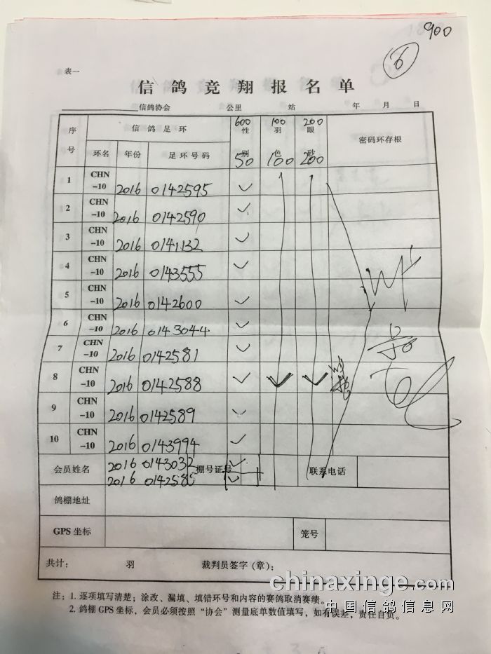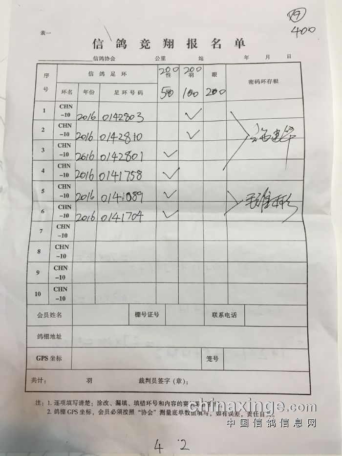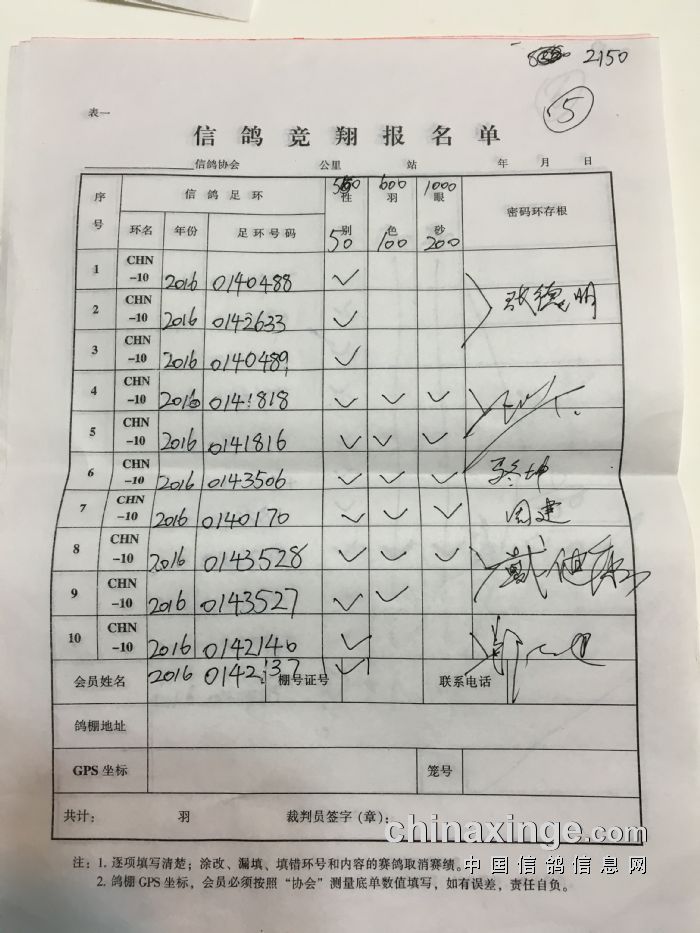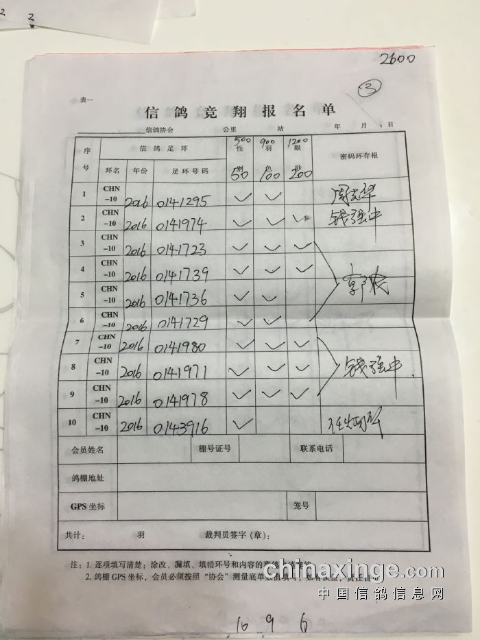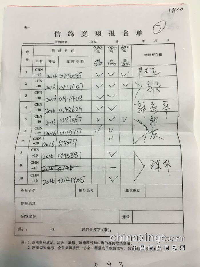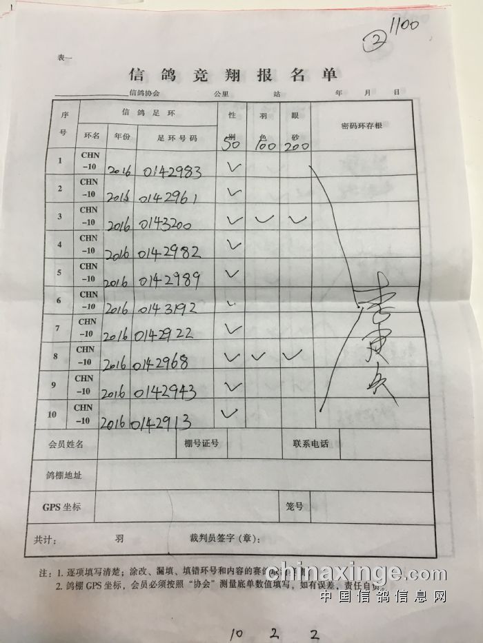 2016年市会“鸽王杯”特比环第二关指定鸽明细表