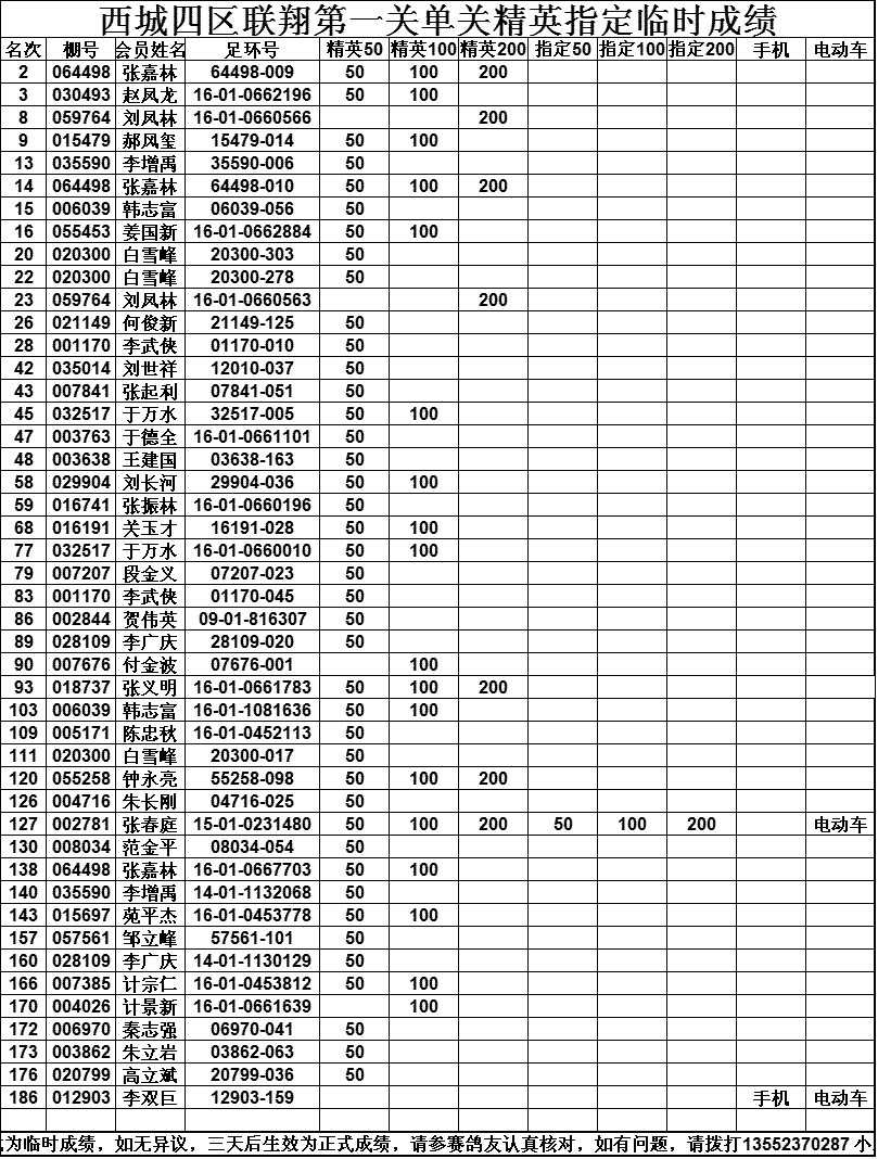 西城鸽会500特比第二关北区临时成绩
