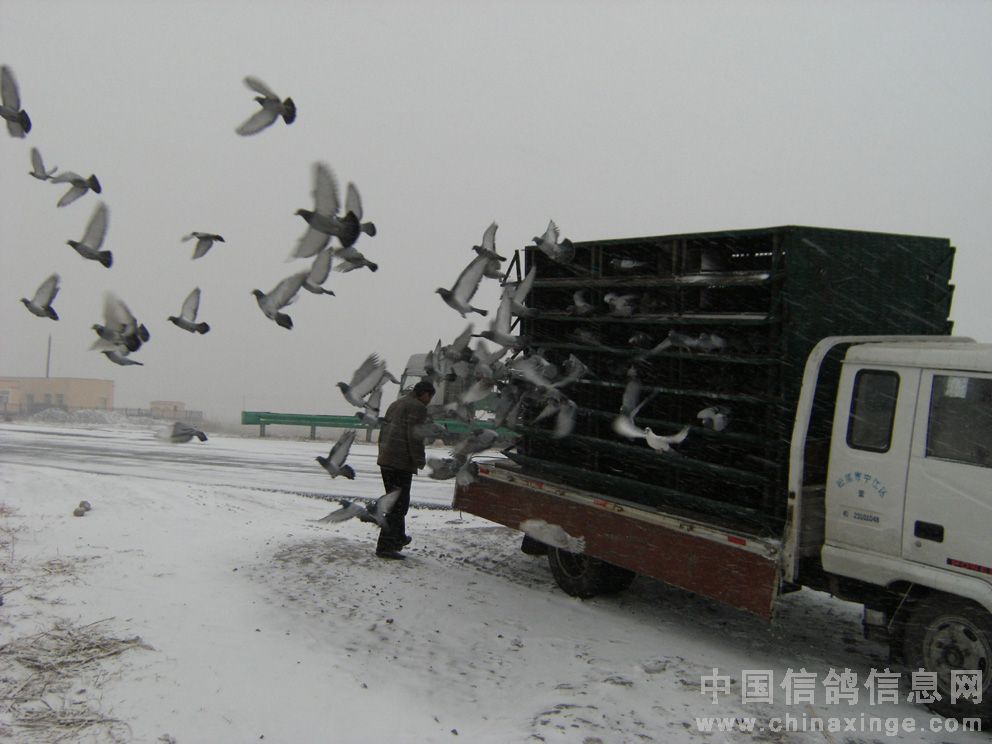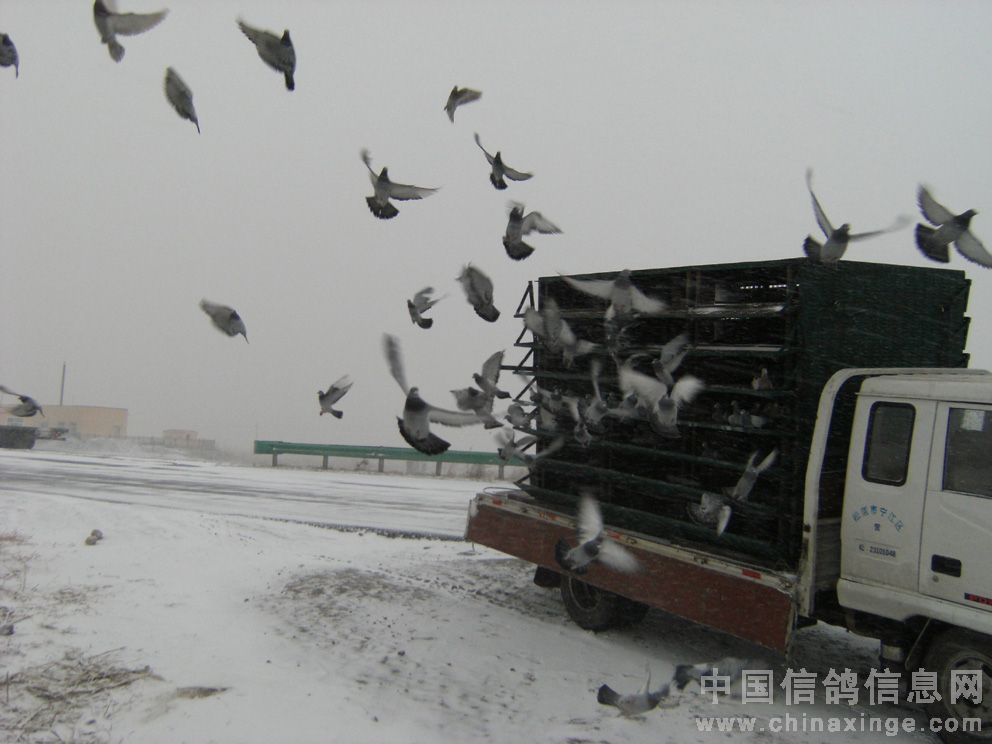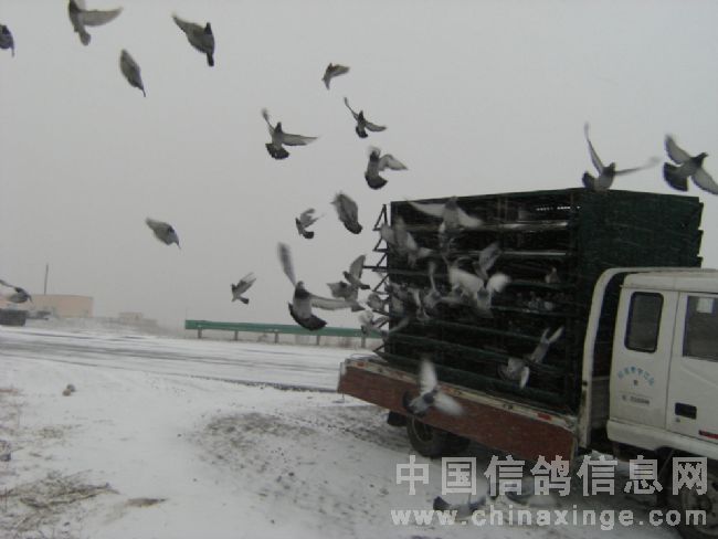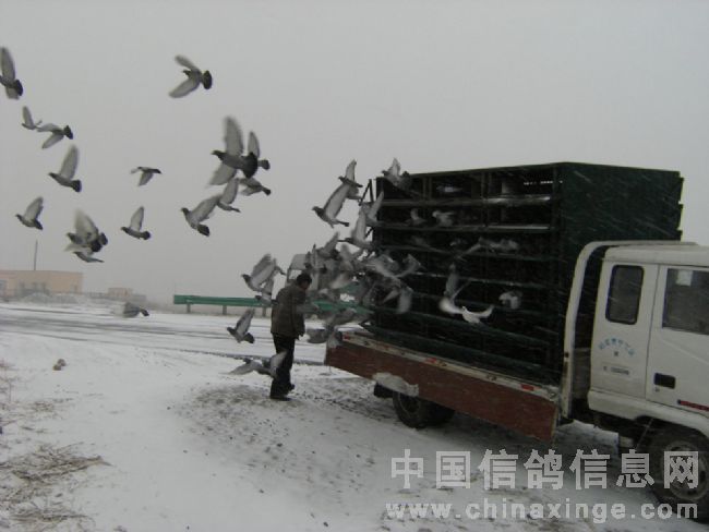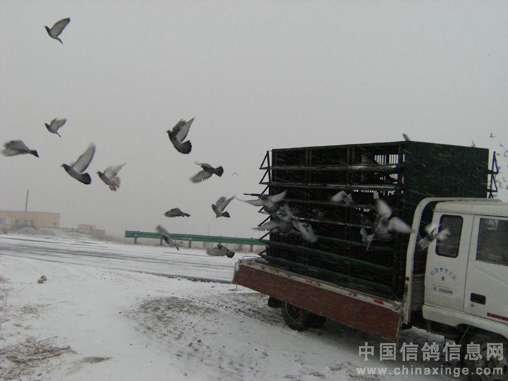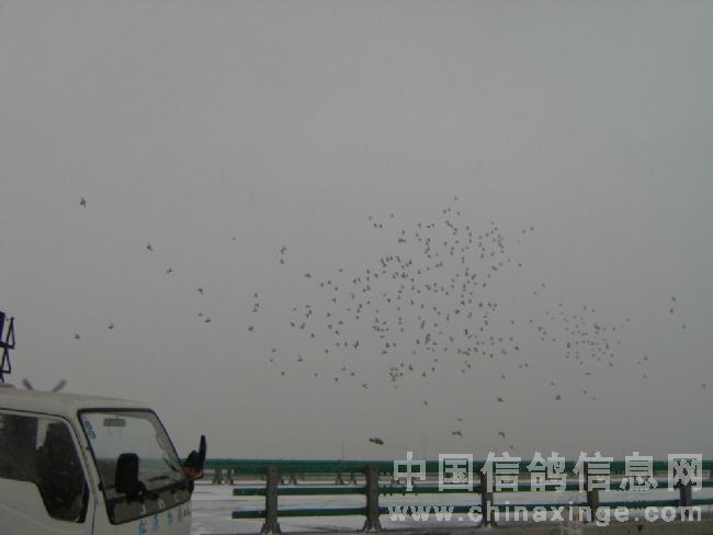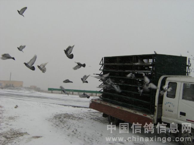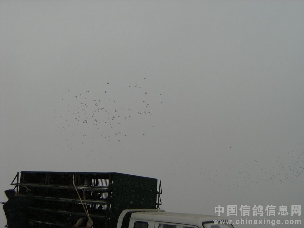 3月12日鸽会计划训放40公里套太,由于天气不好,鸽会改为拐脖店收费站司放。8点10分开笼,赛鸽出笼状况很好,抱成很大一团,但走势不好,在原地久久盘旋。不一会司放地就下起小雪,在回来的路上雪越来越大,鸽子归巢肯定不好,虽然鸽会缩短训放距离,还是不如天算。
