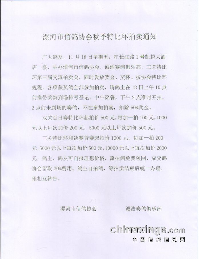 河南省漯河市信鸽协会12月14-15日纯网拍公告