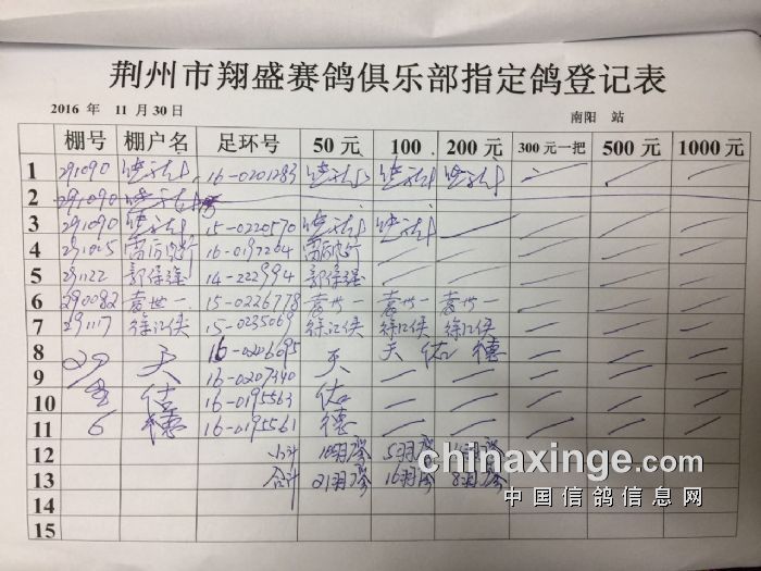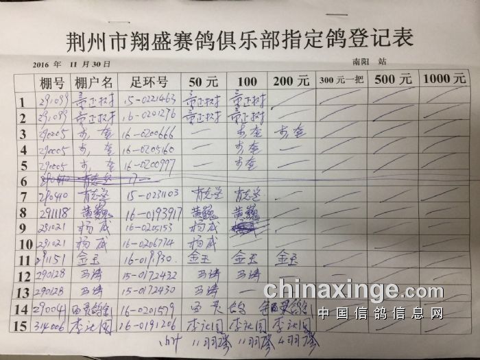 2016年秋11月31日南阳300公里比赛指定鸽明细