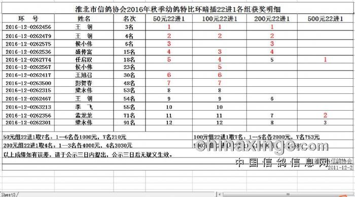 淮北市信鸽协会2016年秋季幼鸽特比环暗插22进1临时成绩