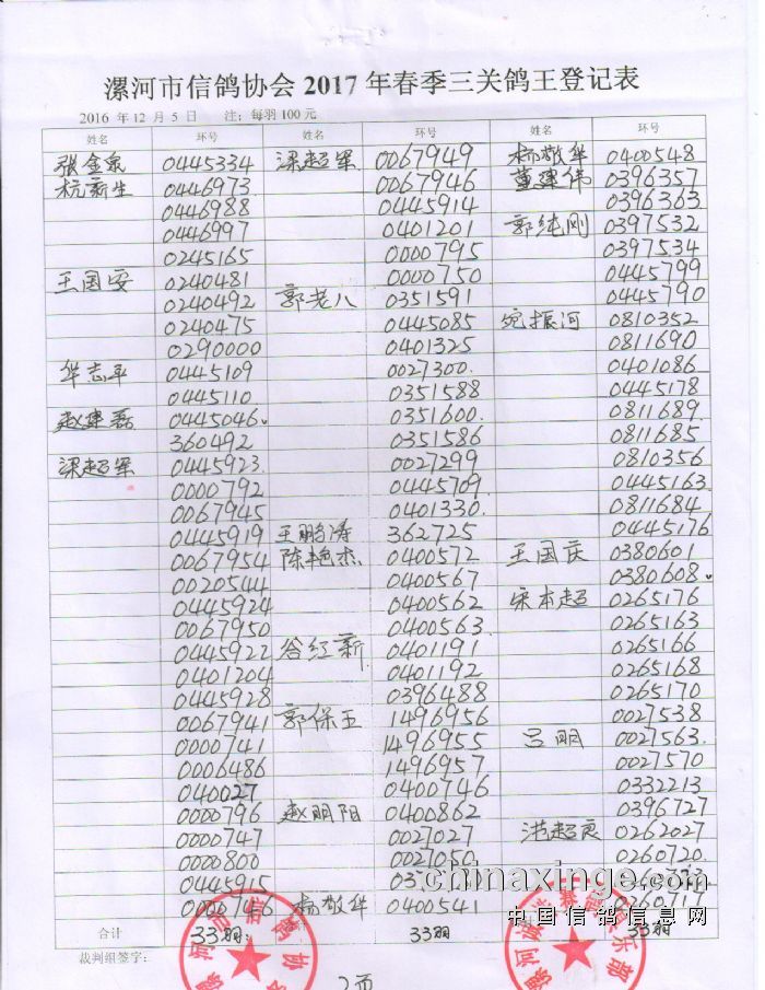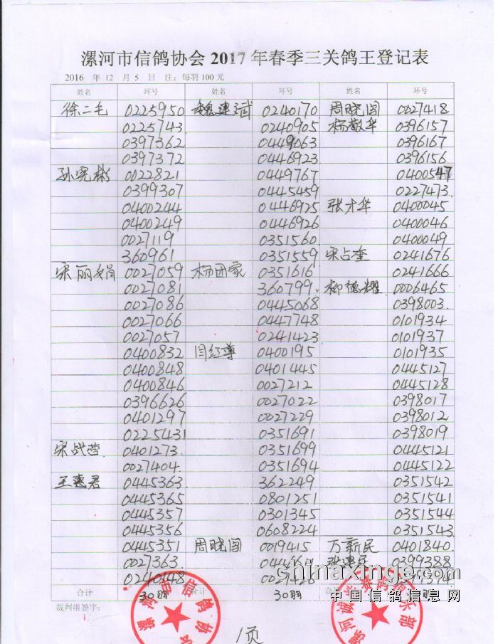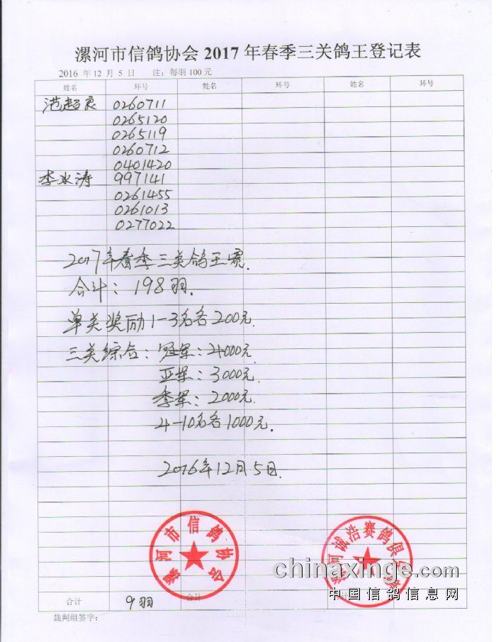 漯河市信鸽协会2019年秋季420公里内丘上笼清单