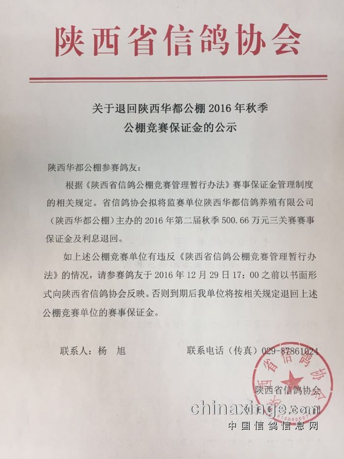 关于退回陕西华都公棚2016年秋季公棚竞赛保证金的公示
