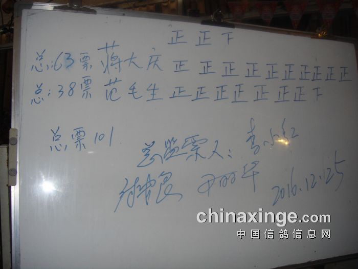 换届选举是以2016年度(巳交会费)在册会员名单为列表,以在册会员到会签名后发一张选票。未到会者失去选举资格。共有101名在册会员报到签名领取了选票。选举按每人只投一票,选出自己心目中最理想的鸽会主席。再由全体会员推选和自荐三名监票员,对所投选票进行监督畅票。畅票结果:共发出选票101张,收回选票101张,这101张选票合法有效。蒋大庆同志以63票当选为邵阳市信鸽协会主席。