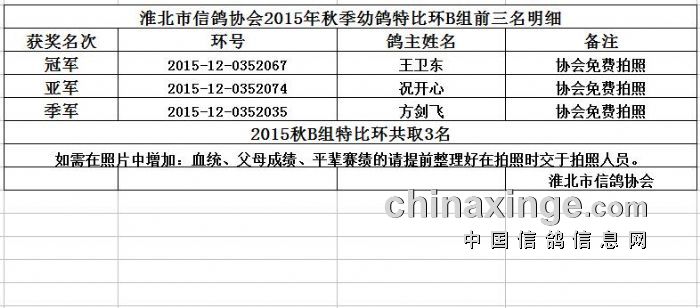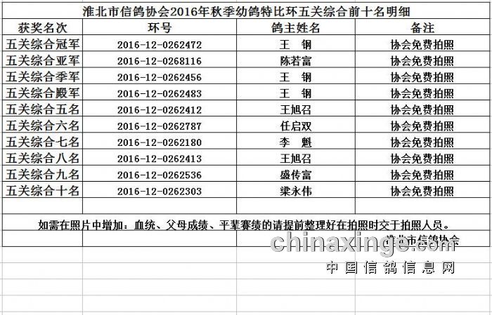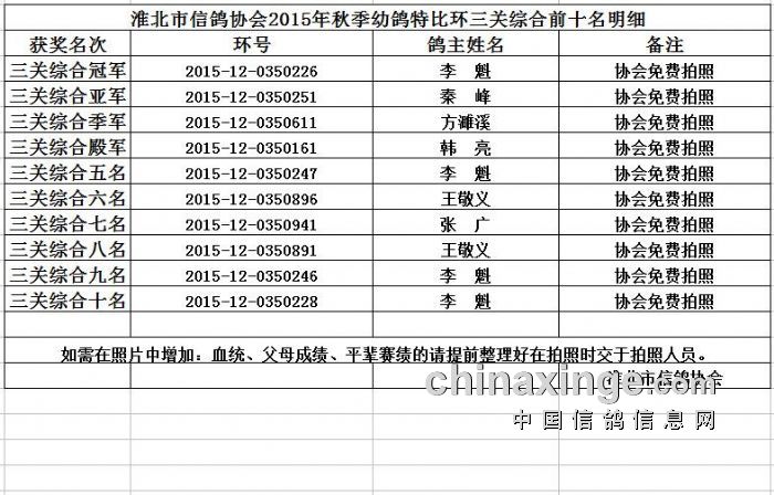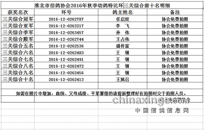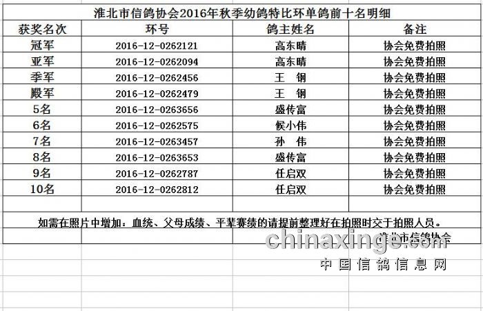 淮北市信鸽协会明日安排为以下获奖鸽拍照,请以下会员明日上午10点以后携带爱鸽到市会集鸽点给赛鸽拍照;敬请广大会员相互转告。