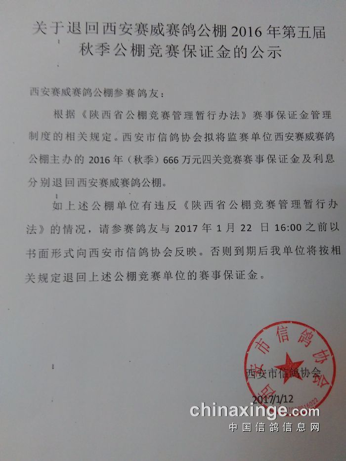 关于退回西安赛威赛鸽公棚2016年秋季公棚竞赛保证金的公示