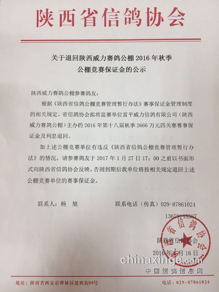 关于退回陕西威力赛鸽公棚2016年秋季公棚竞赛保证金的公示