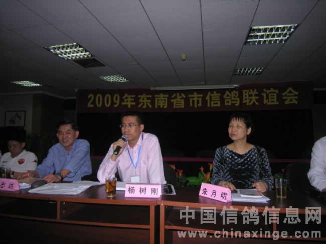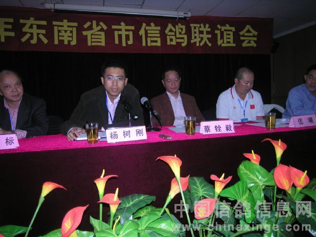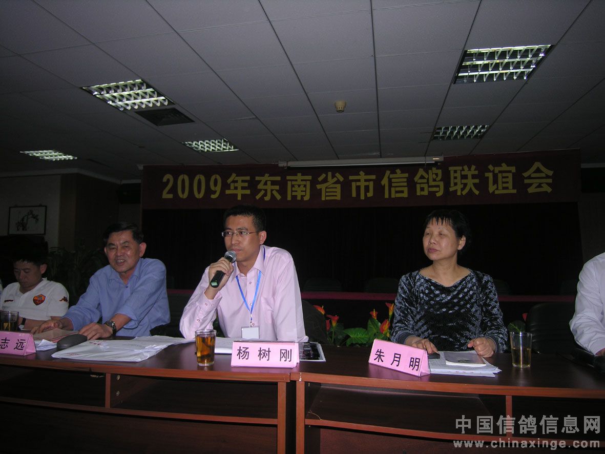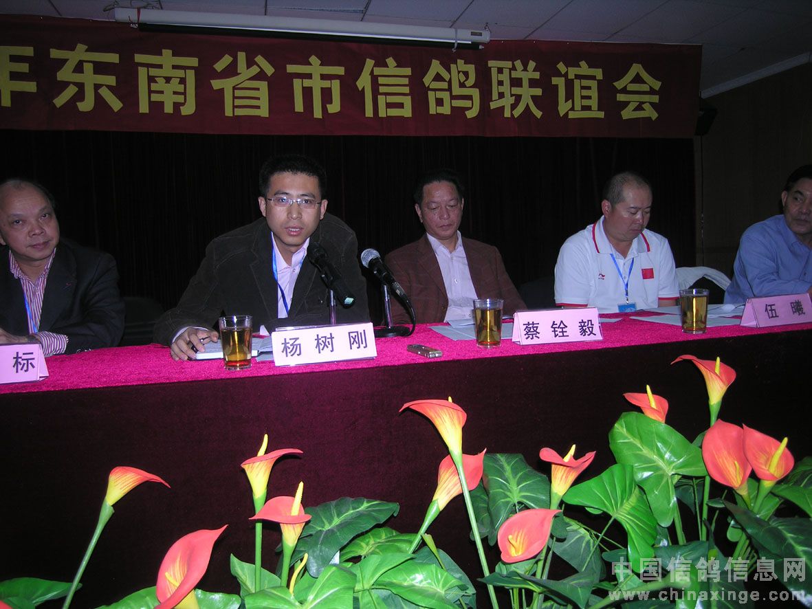 联谊会分为主题发言和大会讨论两个部分,分别由广东省鸽协副主席朱月明和深圳市鸽协主席郑涛主持。中国信鸽协会秘书长(代)杨树刚转达了国家社体中心主任、中国信鸽协会主席胡建国对参加本次会议代表的问候,听取了与会者对赛事改革、公棚管理、鸽协建设等方面工作的意见和建议,对以联谊会的形式探讨信鸽运动的发展深表赞同,他说,正是通过东南省市联谊会的筹划和具体运作,全国信鸽千公里联赛才得以问世,并经过连续数年的举办,在比赛规程和机制上积累了宝贵的经验,希望东南省市鸽协联谊会继续坚持下去,联手开创信鸽运动的新局面。杨树刚说,中国地域辽阔,地形和气候十分复杂,各地可以根据自己的情况举办相应的赛事,这样可以丰富信鸽比赛形式、满足广大鸽友多样化的需求。他还对今年即将举办的鸽王赛、鸽协的组织建设、公棚管理规范等事项作了重要讲话。