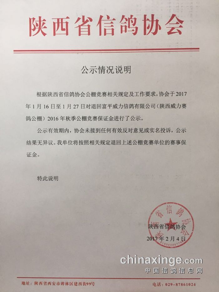 退回陕西威力赛鸽公棚2016年秋季竞赛保证金公示情况说明