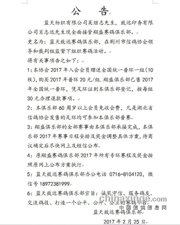 蓝天致远赛鸽俱乐部公告