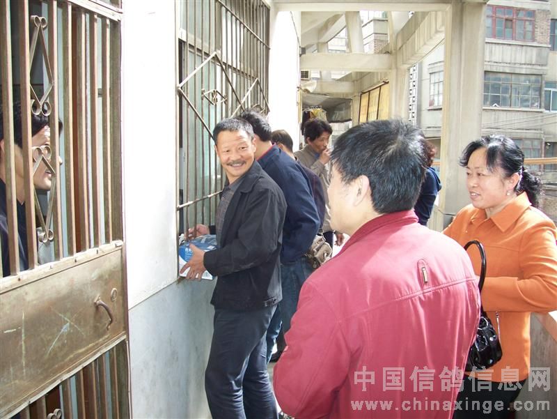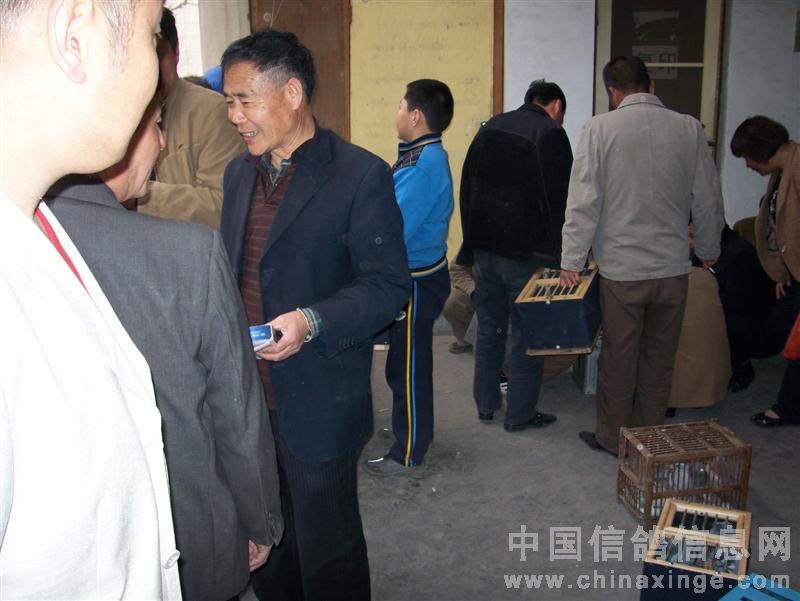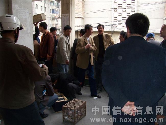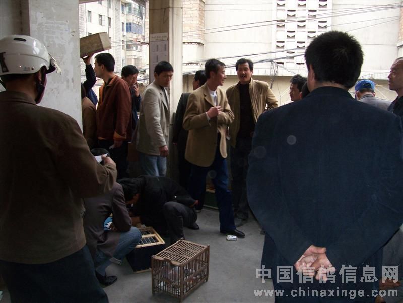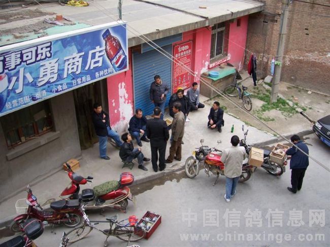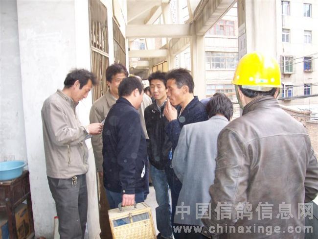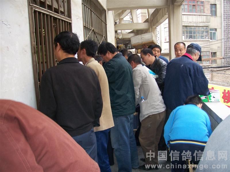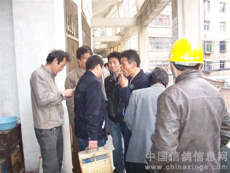 在鸽会楼下等侯成绩的鸽友在一起侃鸽经