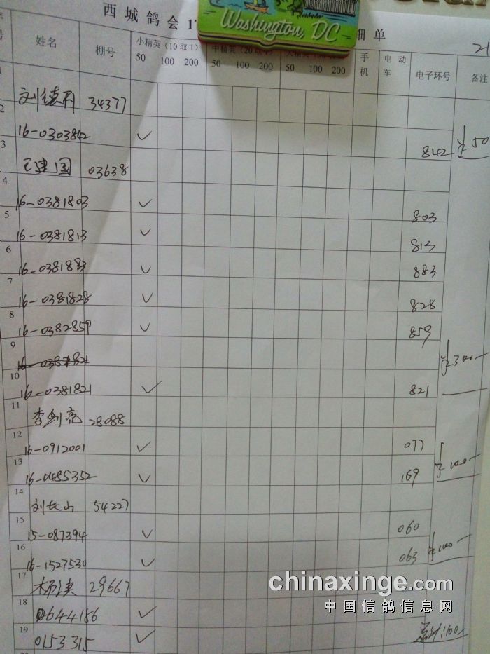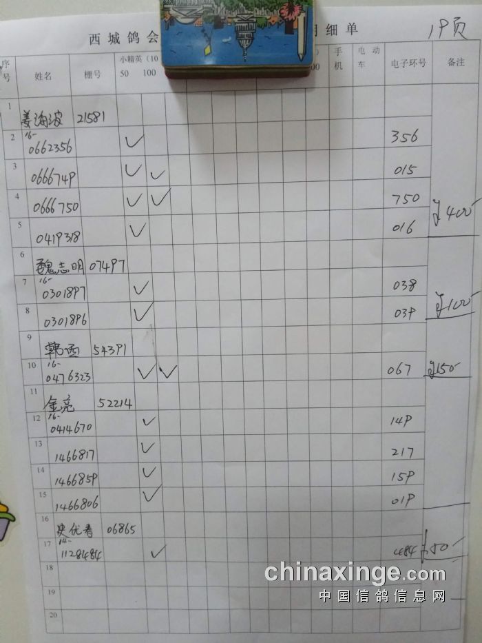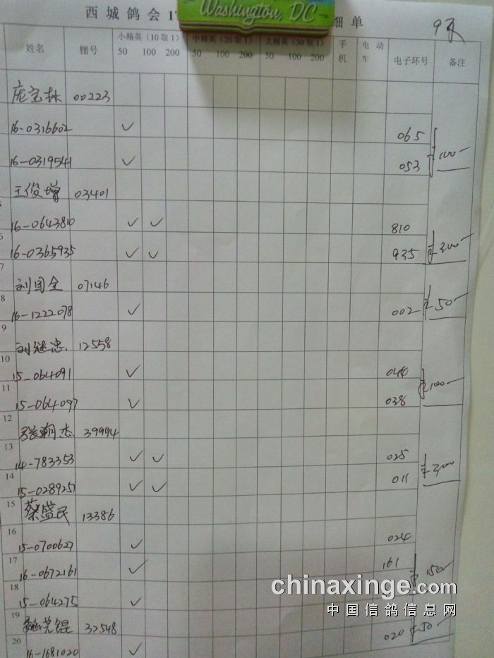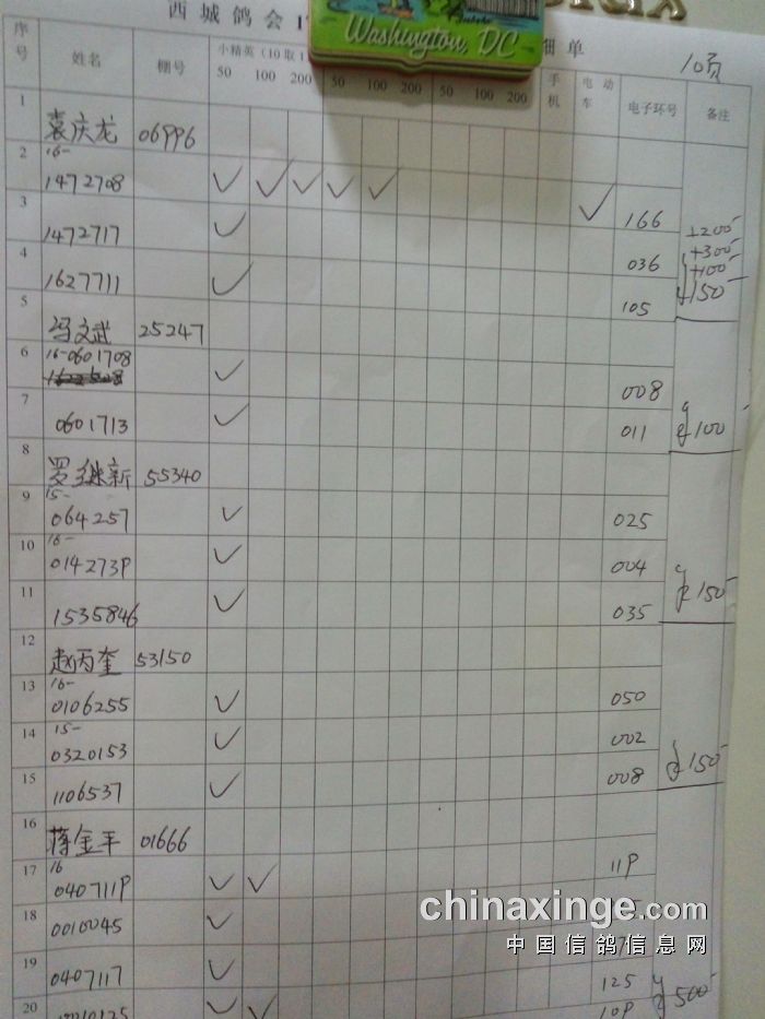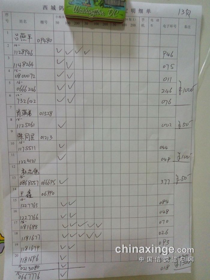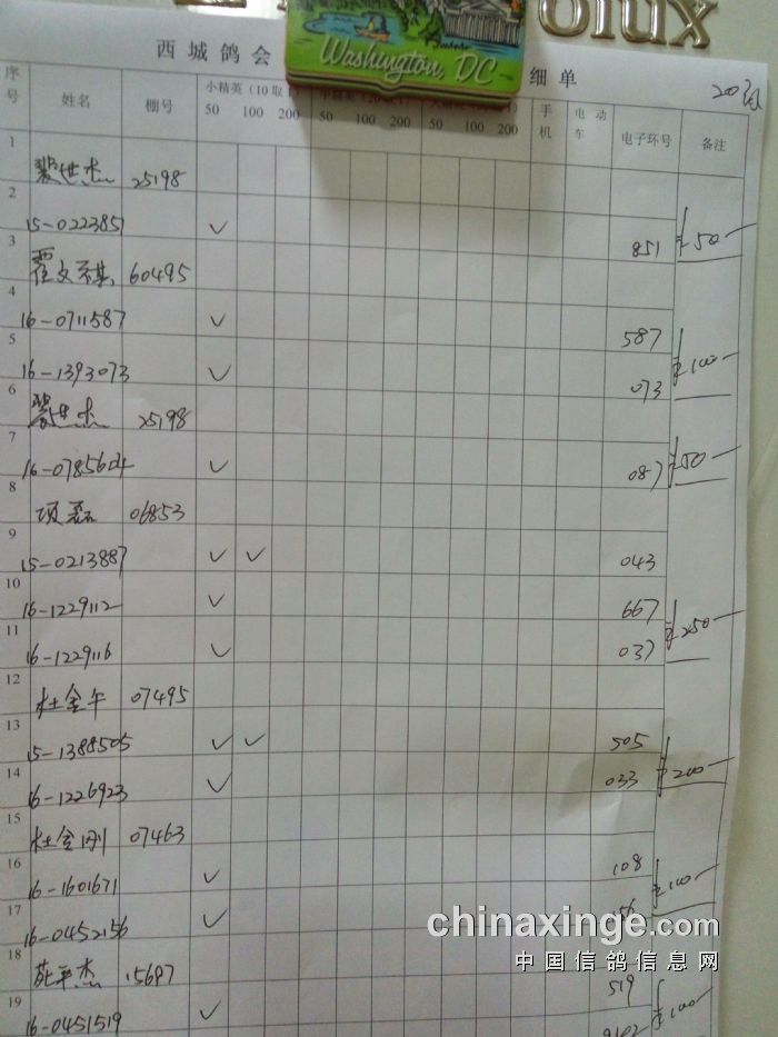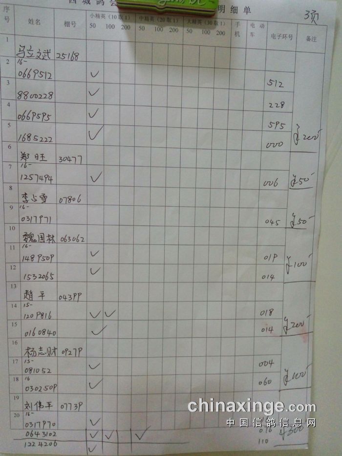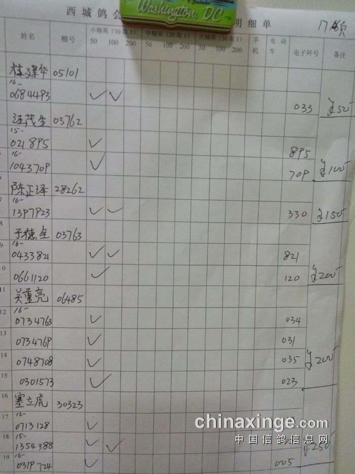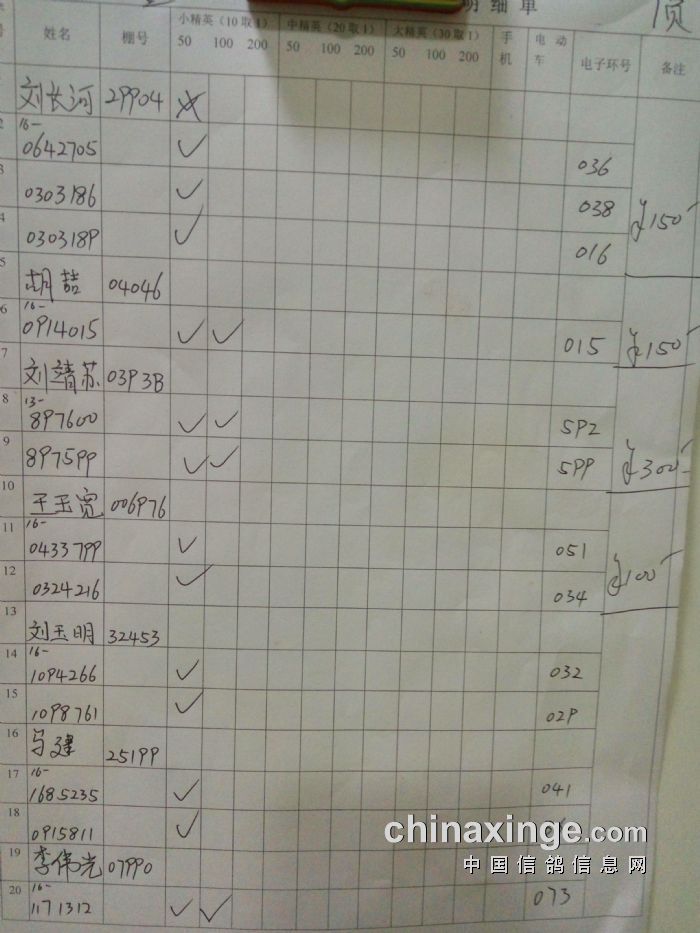 中精英、50元12羽、100元6羽、电动车2羽、手机1羽