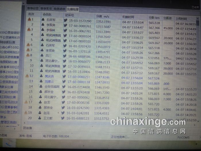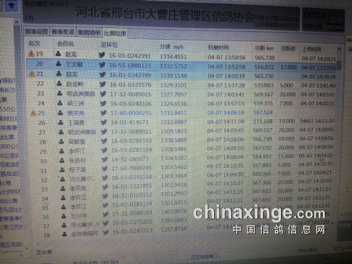 石英军鸽友上传时间在赛鸽归巢后2小时40分钟才上传,鸽会自开办比赛一来第一次出现此类情况,是鸽会异想不到的事情。鸽会每场比赛都有我信任的鸽友帮忙集鸽装笼等过程,我向广大鸽友保证每场比赛的真实性可靠性。