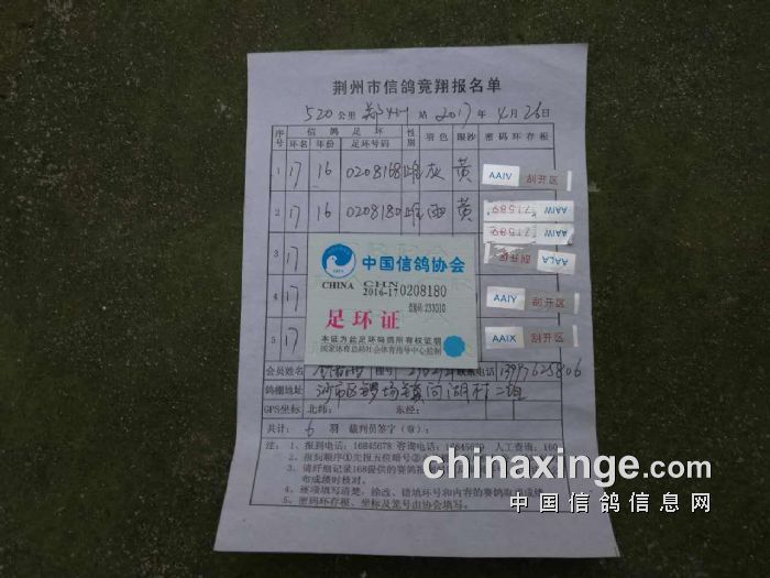 第六名 290286 亞一鸽苑 16-17-0208154